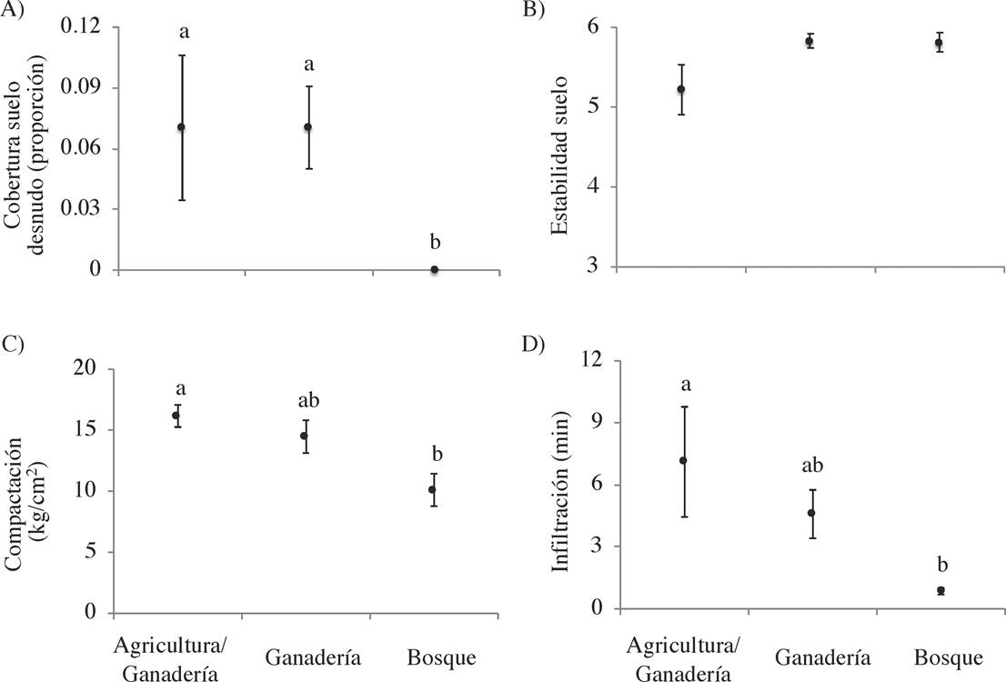 En comparación con la agricultura/ganadería, los sitios con ganadería también tuvieron pocas especies de plantas. Sin embargo, la cobertura del dosel y la obstrucción visual fueron mayores. La proporción de claros basales fue menor. Además, el suelo tuvo menor compactación y mayor infiltración. Otros trabajos realizados en regiones en donde el bosque tropical ha sido transformado a pastizales también han encontrado que éstos tienen baja riqueza específica, cobertura vegetal y biomasa aérea (Kauffman et al. 2003, Arriaga 2006). Además, los suelos tienen mayor densidad aparente y menor porosidad total (García-Oliva et al. 1994, 2006b, Martínez-Trinidad et al. 2008, Sandoval-Pérez et al. 2009).