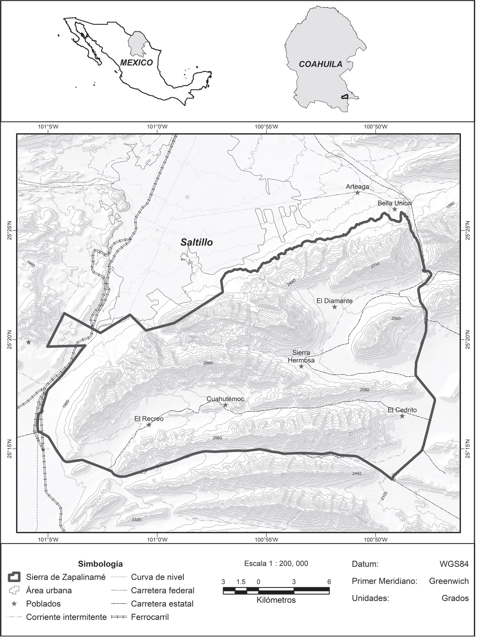 Área de estudio. La Sierra de Zapalinamé se encuentra aledaña de la ciudad de Saltillo, al sureste del estado de Coahuila dentro de los municipios de Saltillo y Arteaga, se ubica entre las coordenadas 25º 15' 00" - 25º 25' 58.35" N y 100º 47' 14.5" - 101º 05' 3.8" O (Figura 1). Al norte y al este, colinda con la carretera 57 (México-Piedras Negras), al Oeste, con la carretera 54 (Saltillo-Zacatecas) y al sur está limitada por la coordenada de latitud 25º 15' 00" N. La región pertenece a la subprovincia fisiográfica de la Gran Sierra Plegada; el macizo incluye valles, planicies y montañas. La orientación de los pliegues transversales es de este a oeste, las altitudes van desde 1,590 m en el pie de monte, hasta 2,200 m en los valles intermontanos, alcanzando su mayor elevación en el cerro El Penitente, a 3,140 m (UAAAN 1998). La zona serrana se compone de cañones, con pendientes abruptas y topografía accidentada. Las rocas que afloran en el área son de tipo sedimentarias marinas del Jurásico y Cretácico; las rocas calizas cubren el 43 % del área, mientras que las areniscas y los conglomerados solamente el 17 % (SPP 1983). Los suelos aluviales ocupan casi el 30 % del área. Los suelos de tipo litosol cubren el 49 % y los de tipo rendzina el 29 %. En menor proporción se localizan los xerosoles cálcico y feozem calcárico. El clima predominante en la región es de tipo BSkw, en las partes altas el clima es de tipo C(w0). La temperatura media anual es de 16.9 ºC mientras que la precipitación media anual es de 498 mm, las lluvias son de tipo convectivo, coincidiendo con los meses calientes del año (UAAAN 1998).
