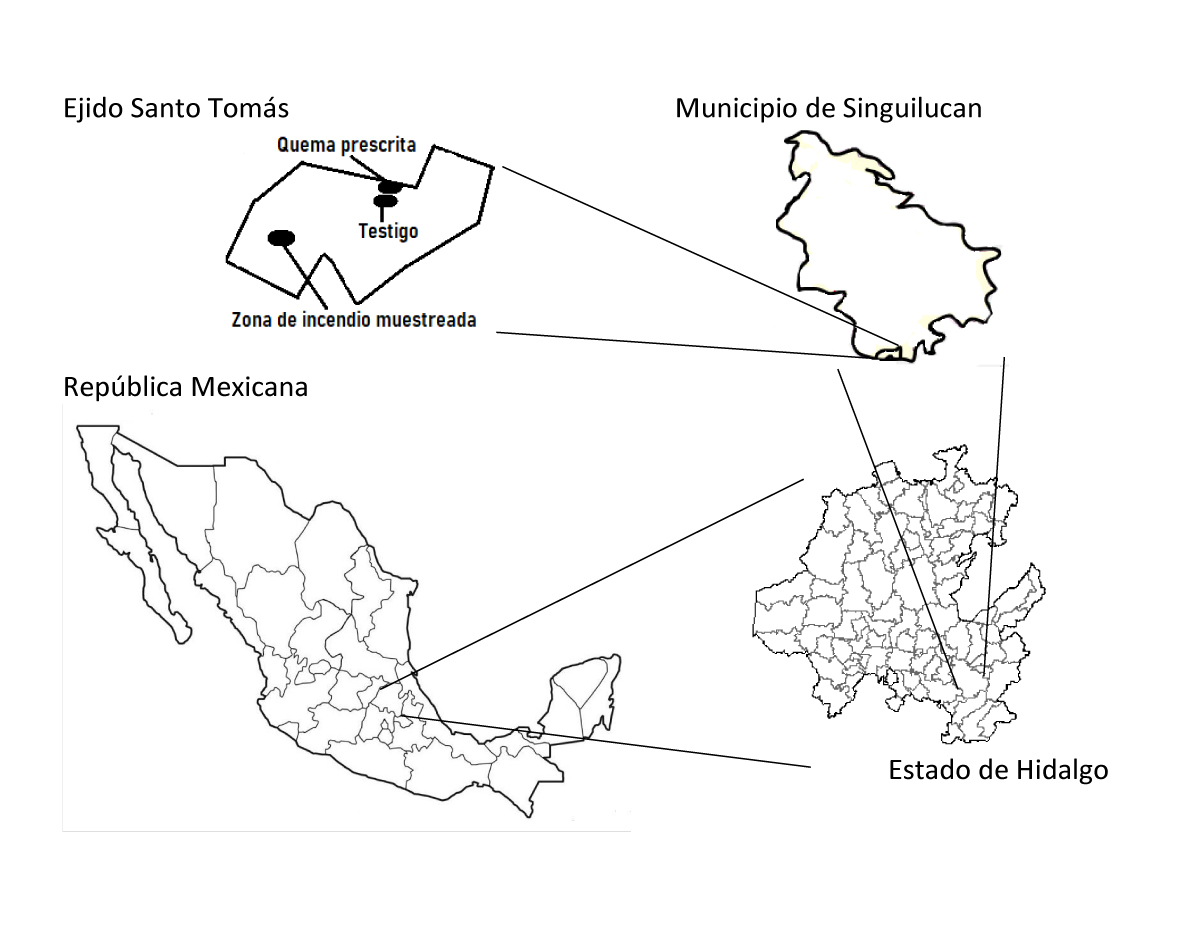Ubicación del área de estudio. El presente estudio se realizó en el Ejido Santo Tomás. Se ubica dentro del Municipio de Singuilucan, Hidalgo (Figura 1). El predio se localiza al sur de Singuilucan, aproximadamente 1 km al suroeste de la localidad Francisco I. Madero, entre los paralelos 19° 53’ 54.94’’ N a 19° 52’’ 00.25’’ N, y entre los meridianos 98° 28’ 08.88’’ O a 98° 31’ 27.71’’ O. Presenta un clima de tipo C (W1)(w) templado subhúmedo con lluvias en verano, con precipitación media anual de 752.3 mm y una temperatura media anual de 15.2 °C (INEGI 1992). Muestra un intervalo altitudinal de entre 2,860 y 3,200 m snm; y el terreno tiene una pendiente promedio < 12 %.
