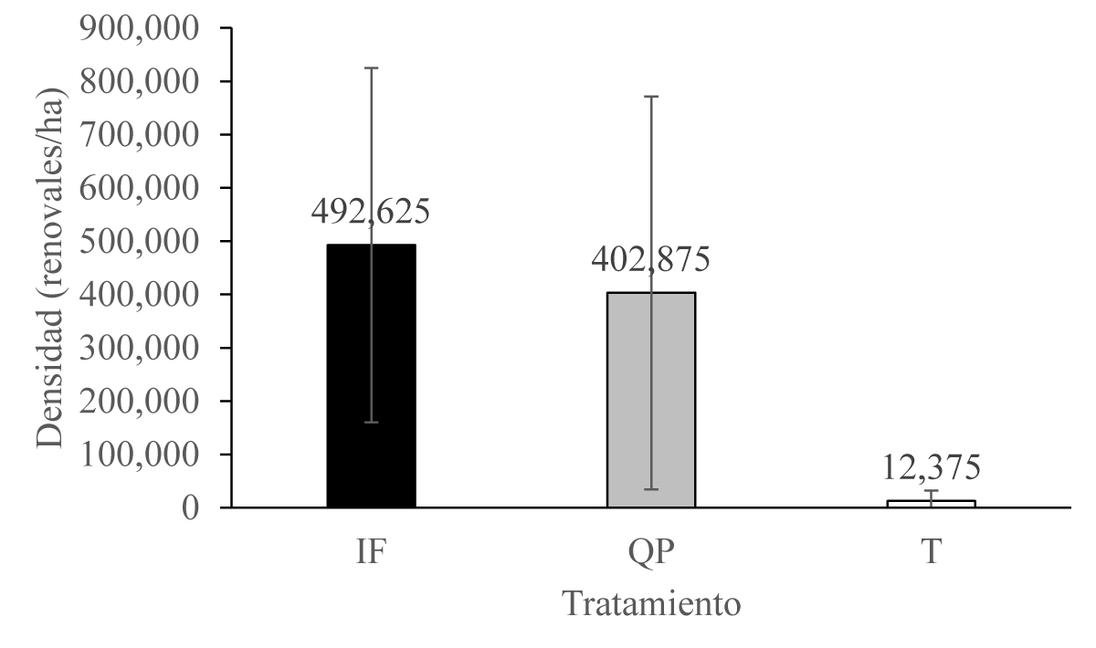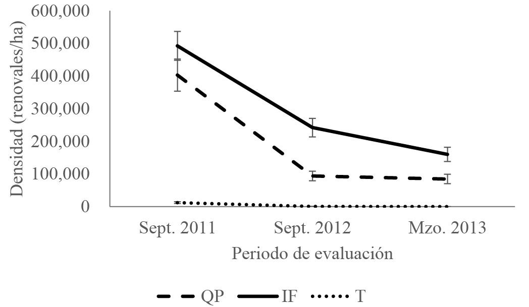 Figura 6 Dinámica de la regeneración natural de P. montezumae, en incendio forestal (IF), quema prescrita (QP) y testigo (T). La barra de error indica error estándar.