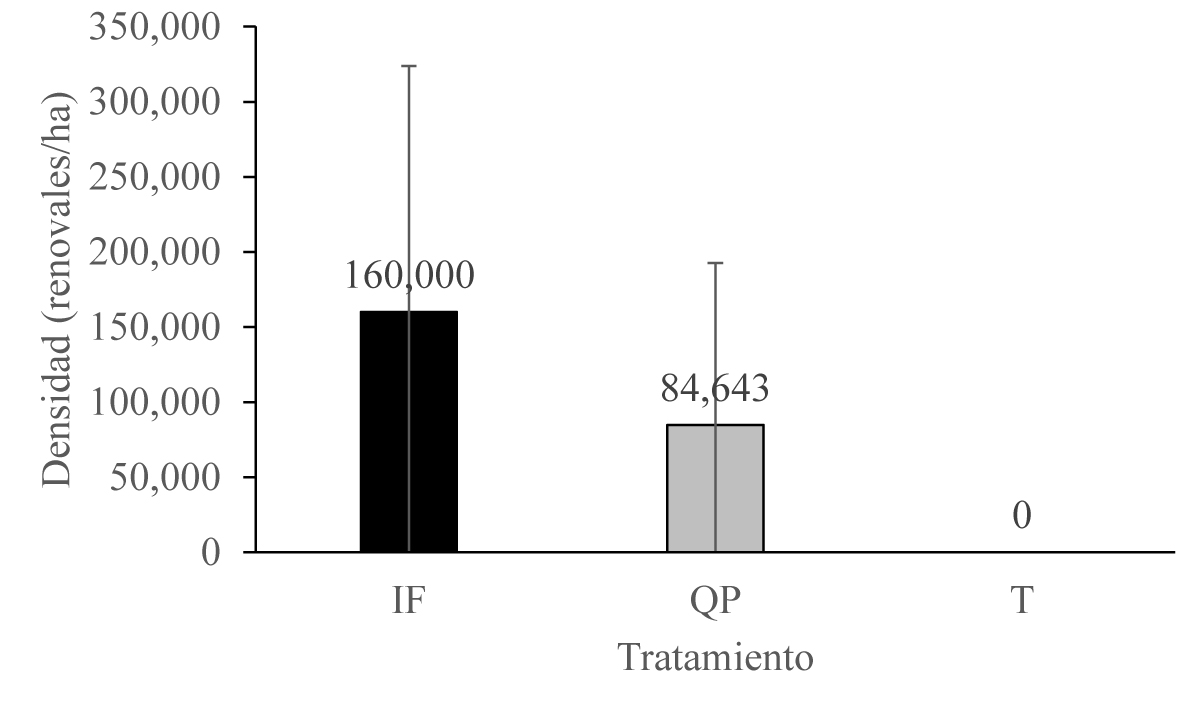 Figura 4 Densidad de regeneración de P. montezumae a 21 meses de la aplicación de quema prescrita (QP), y a 42 meses de un incendio forestal (IF). T = testigo.