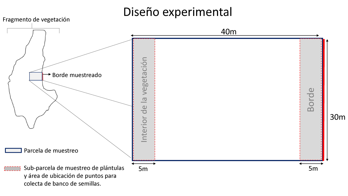 Figura 1 Esquema de parcela de muestreo dentro de un fragmento de vegetación remanente. Las sub-parcelas de borde e interior fragmento fueron utilizadas para el muestreo de semillas.