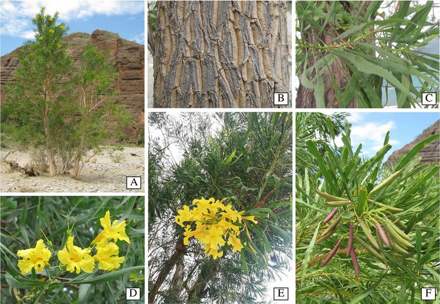 In addition to the simple, pulvinate, entire, verticillate leaves (Figure 1C, E-F) and a 4-loculed ovary, Astianthus viminalis is also recognized for being a tree with rough bark (Figure 1A-B), 10 to 25 m high, generally occurring in dense populations (Gentry 1992) - the species is sometimes also described as a shrub (Fischer et al. 2004). Since Astianthus commonly grows near rivers and streams, flowering and fruiting branches sprouting from subterranean stoloniferous roots can result in a shrubby aspect (as observed by E.M.M.S.). Astianthus has terminal, paniculate inflorescences (Figure 1E), campanulate flowers, 5-dentate calyces (Figure 1D), and tubular-infundibuliform yellow corollas (Figure 1D). The capsular fruits are reddish-green, terete, fusiform, and glabrous (Figure 1F), with winged seeds borne perpendicularly on the septum and parallel to the false septum (Gentry 1992).