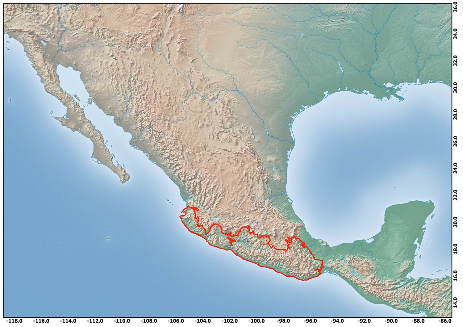Study area. The physiographic province of SMS is located southwest of Mexico, between 15° 40’- 19° 40’ N, and 94° 45’- 104° 40’ W. It has an extension of 195,700 km2. It comprises the southeast of Jalisco, over 80 % of Colima, the southern region of the State of Mexico, Michoacán, Puebla and almost the complete extension of Guerrero, with the Istmo de Tehuantepec as the geographic limit in Oaxaca. The altitudinal gradient ranges from 0 to 3,710 m asl (Figure 1), (INEGI 2001).