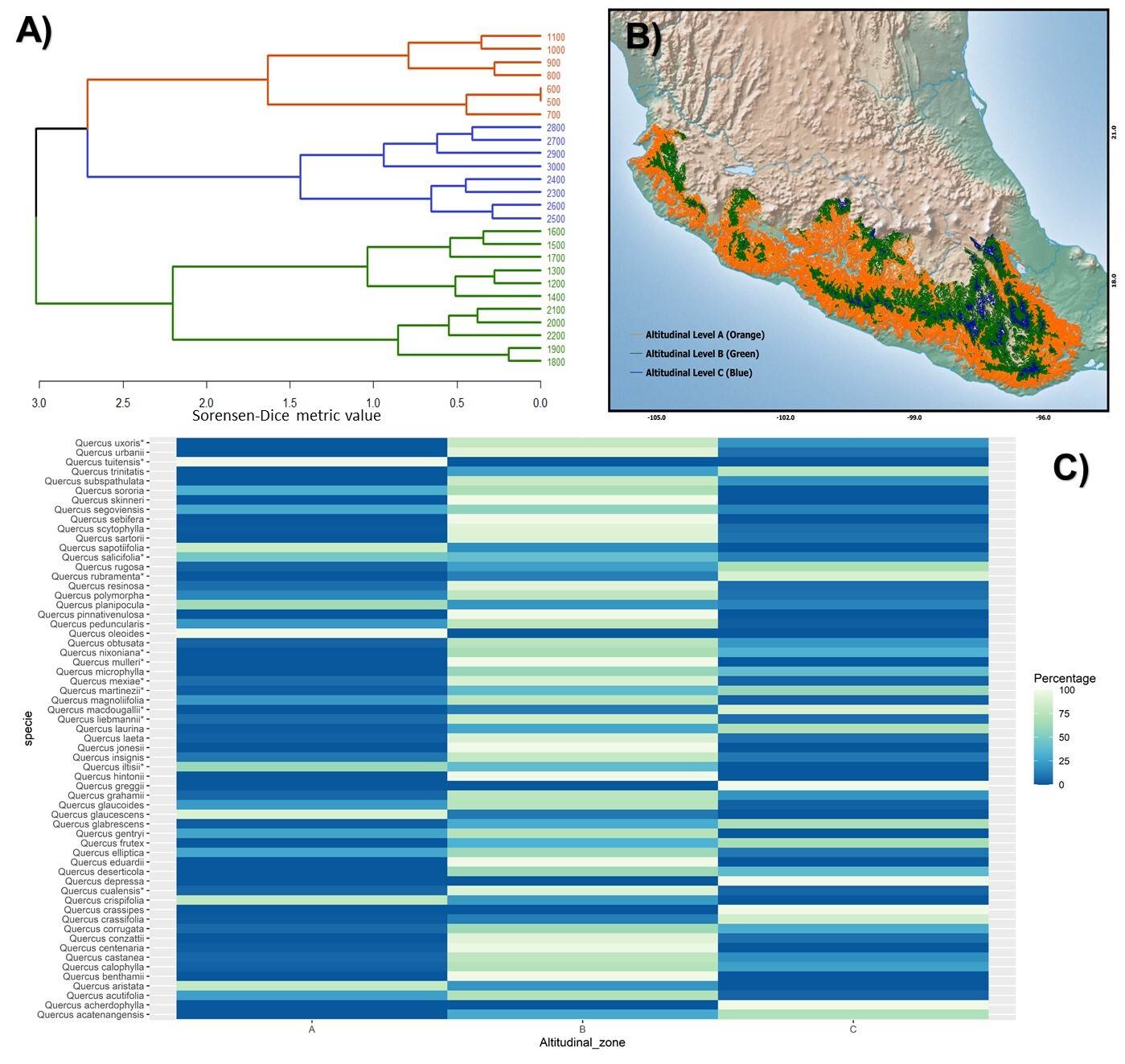 Figure 3 A) Dendrogram produced by the classification of oak distribution based on the Sorensen-Dice index. Altitudinal zone A corresponds to zones ranging from 500 to 1,100 m asl (orange color), altitudinal zone B corresponds to zones ranging from 1,200 to 2,200 m asl (green color), altitudinal zone C corresponds to zones ranging from 2,300 to > 3,000 m asl (blue color), on the X axis = similarity index; B) Altitudinal zonation found in this study for the Sierra Madre del Sur based on the oak distribution; C) A heatmap of the altitudinal distribution for the 61 oak species across the three altitudinal zones. Dark colors represent low percentages of records for each species in each altitudinal zone while light colors represent high percentages of records for each species in each altitudinal zone.