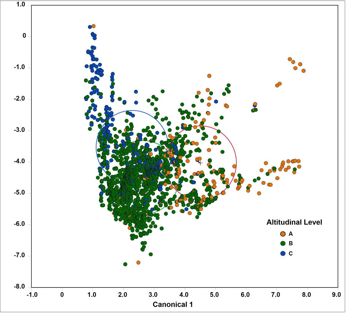 Climate differentiation of the altitudinal zones. A total of 19 bioclimatic variables were downloaded for the 3,267 records from the WorldClim database v1.4 (Fick & Hijmans, 2017) (www.worldclim.org). From these records, a correlation analysis was conducted to eliminate those highly correlated variables. A total of nine bioclimatic variables (Bio2, Bio3, Bio4, Bio5, Bio6, Bio14, Bio15, Bio16 and Bio18) were used to evaluate which climatic variables have greater discriminating power among different altitudinal zones detected through cluster analysis. However, since not all variables discriminate in the same way, a stepwise variable selection was conducted. As a general criterion to select a variable, F value associated with each variable was used, in such a way that if the F value was small, the variable would discriminate little, while large values of F suggest greater discriminating power. Initially, we selected the variable with the highest F value, subsequently the F value was evaluated for the unselected variables and a new variable with the highest F value was selected. This procedure was repeated until a variable with the highest F value was statistically non-significant. The discriminant analysis was conducted with the software SAS (2012) using a linear discriminant method.