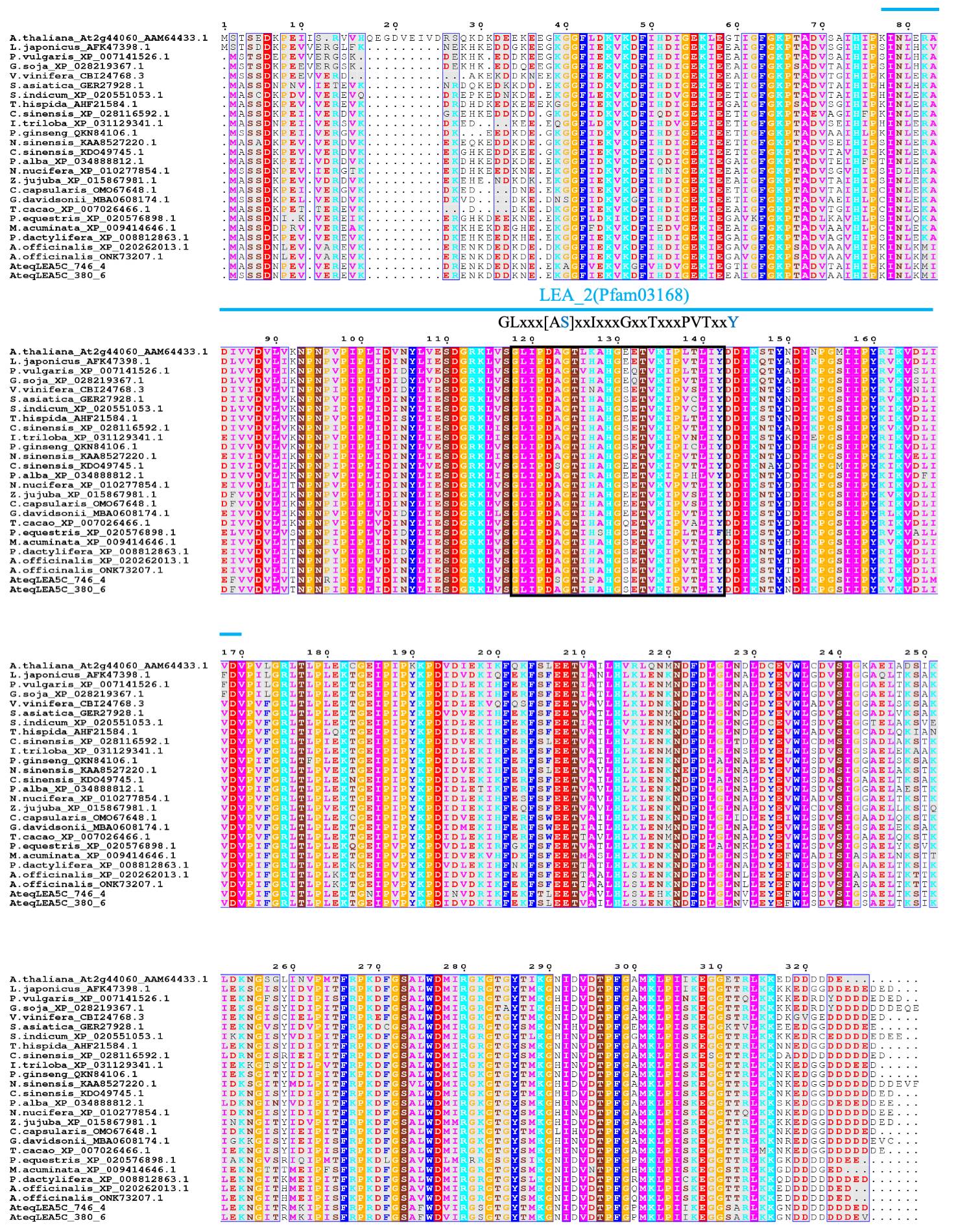 Figura 3 Dominio y motivo conservados en AteqLEAPs del Grupo 5C. La línea azul indica el domino Pfam (03168) de las LEA_2. El recuadro negro indica el motivo G-L-x(2)-[2]-[AILV]-x-[IV]-x-[GV]-x(2)-[PT]-x-[PS]-[ILV]-[NPST]-x(2)-[GI] identificado en A. thaliana (Hundertmark & Hincha 2008). La secuencia en letras negras muestra los aminoácidos encontrados en A. tequilana que corresponden al consenso de A. thaliana. Las letras azules muestran aminoácidos en A. tequilana distintos al consenso. La x indica una posición que puede estar ocupada por cualquier residuo.