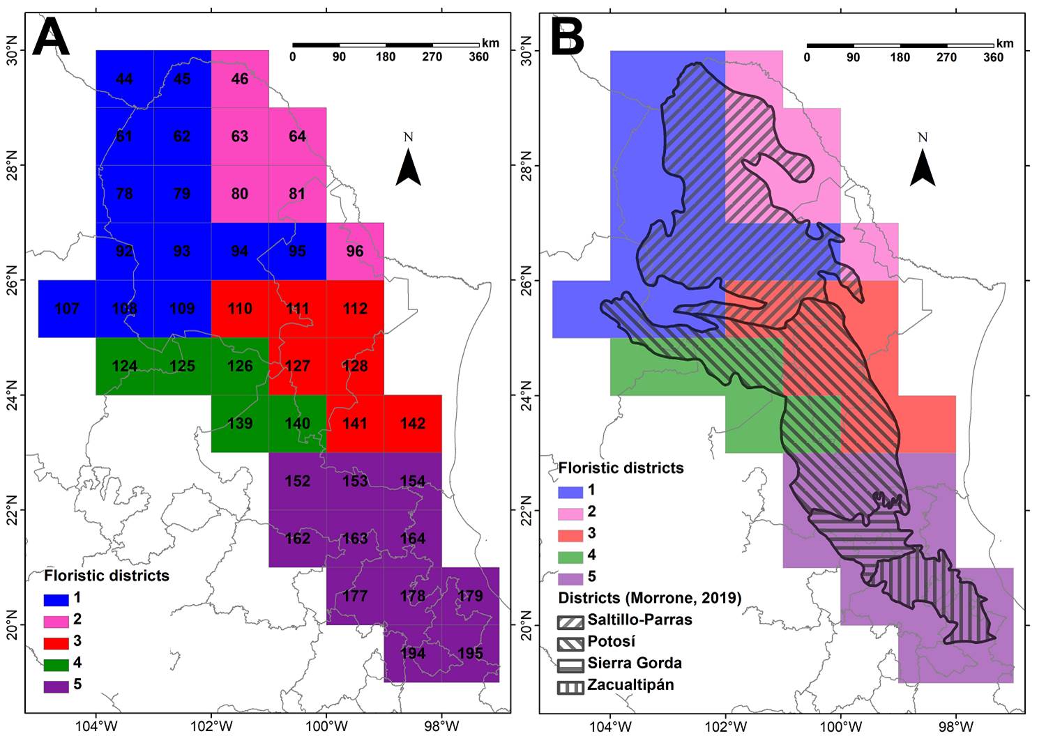 Figure 7 A. Geographical arrangement of the floristic districts of the Sierra Madre Oriental. B. Comparison of floristic districts with the regionalization proposed by Morrone (2019).