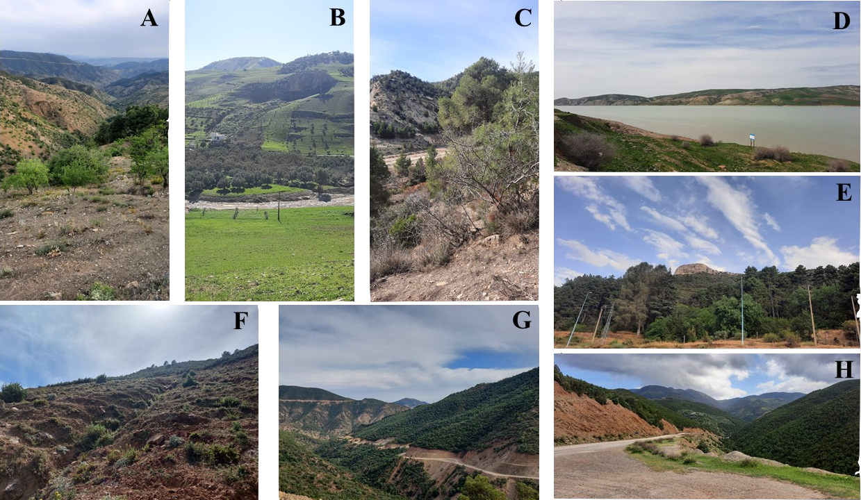 Figure 2 Some photos that illustrate the richness and biodiversity in the province of Taza. [A: Tainaste: Longitude (4° 7′ 20″ W) - 4.1223 Latitude (34° 33′ 39″ N) 34.561. B: Taifa: Longitude (4° 0′ 58″ W) - 4.0161 Latitude (34° 21′ 4″ N) 34.3511. C: Jbarna: Longitude (3° 51′ 41″ W) - 3.8616 Latitude (34° 30′ 18″ N) 34.5051. D: Matmata: Longitude (4° 32′ 51″ W) - 4.5477 Latitude (34° 6′ 31″ N) 34.1086. E: Bab Boudir: Longitude (4° 7′ 18″ W) - 4.1218 Latitude (34° 4′ 6″ N) 34.0685. F: Bni Ftah: Longitude (4° 3′ 15″ W) - 4.0544 Latitude (34° 29′ 11″ N) 34.4865. G: Oulad Chrif: Longitude (4° 6′ 5″ W) - 4.1015 Latitude (34° 18′ 11″ N) 34.3031. H: Bab Marzouka: Longitude (4° 8′ 44″ W) - 4.1457 Latitude (34° 11′ 34″ N) 34.193.