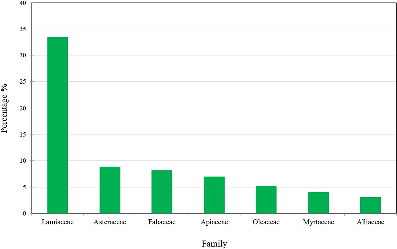 Systematic analysis of local medicinal flora. Botanical family.- Forty-eight families were identified for 91 species (Appendix 1). The seven most frequent families (Figure 4) are Lamiaceae (33.5 %) with 16 species, followed by Asteraceae (8.9 %), Fabaceae (8.2 %), Apiaceae (7 %), Oleaceae (5.3 %) and Myrtaceae (4.1 %).