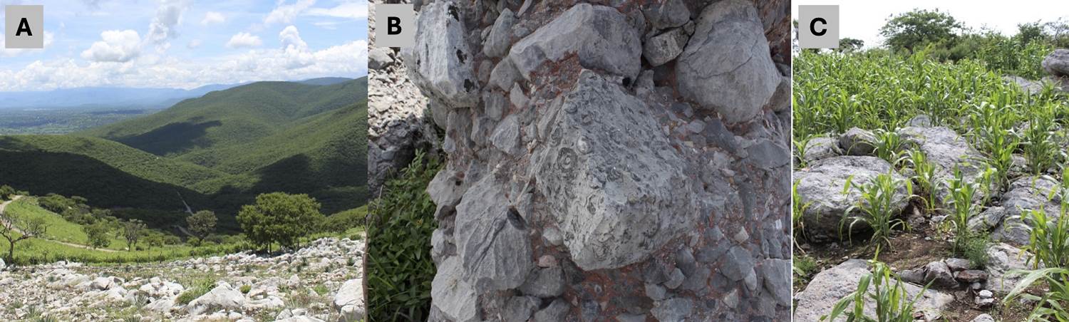 Figure 2 Typical karstic landscape of Zumpahuacán, Estado de Mexico: a) Smooth hills with tropical dry forest; b) Cretacic-Jurassic sedimentary rocks; c) milpa growing between sedimentary rocks.