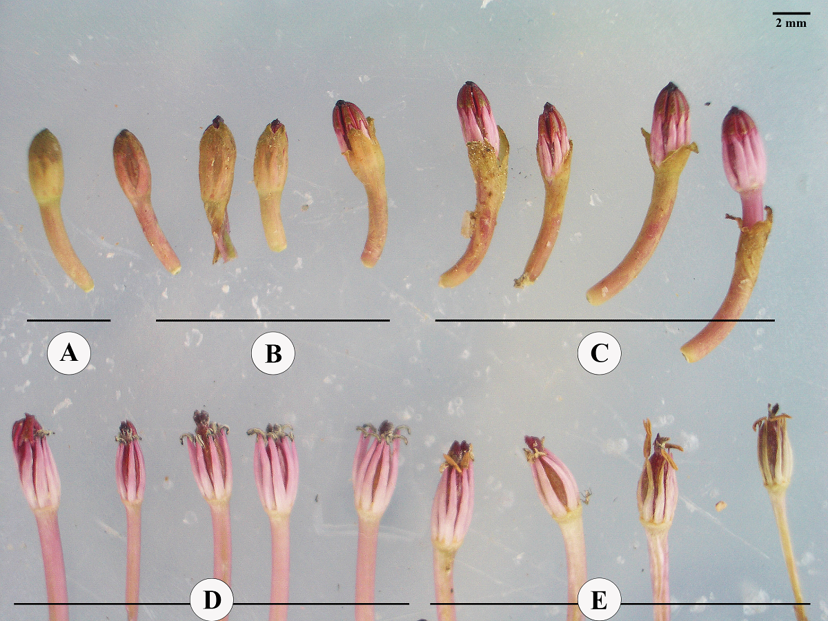 Flower stages. Five discrete stages of flower morphology and development were identified (Figure 2A-E).