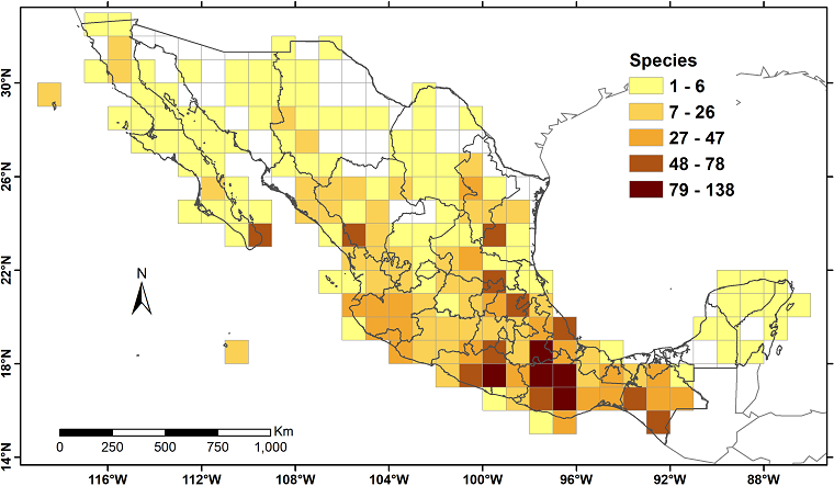 Se identificaron como raras 2,705 especies. Las celdas más ricas se encuentran en el sur del país. Sólo 302 especies han sido evaluadas con los criterios de la IUCN, las restantes 2,403 al menos deberían de tener la categoría de Casi amenazadas (NT). Una celda en la Sierra Norte de Oaxaca contó con la mayor diversidad alfa; sin embargo, sólo 10 de ellas tienen una evaluación por la IUCN, para otras 81 especies se determinaron categorías como Vulnerable (VU), En peligro (EN) y En peligro crítico (CR).