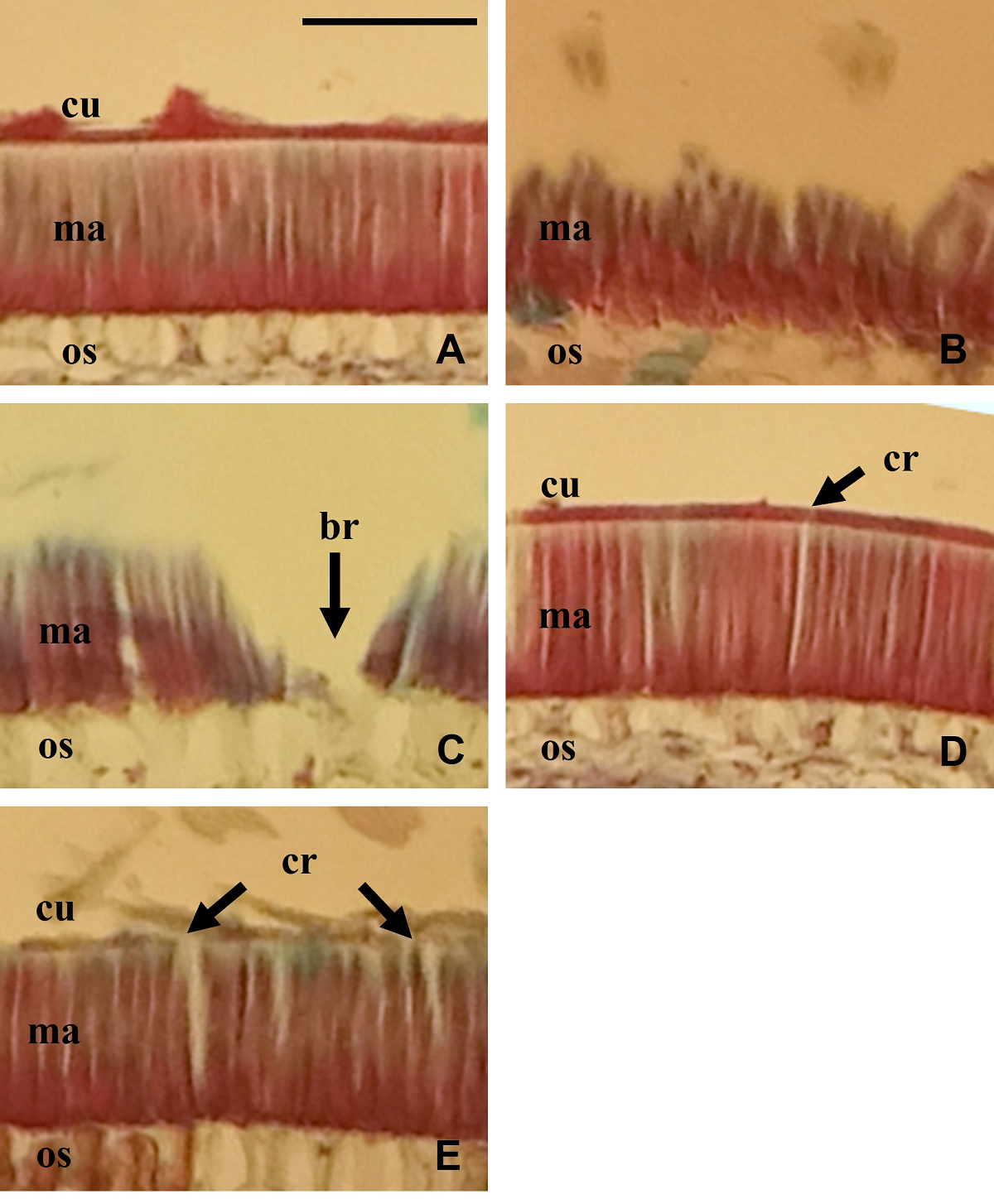 Figure 1 Teramnus labialis seeds coat morphology. (A) seeds without scarifying (control), (B) seeds scarified with sandpaper, (C) seeds scarified with sulfuric acid, (D) seeds scarified with hot water and (E) seeds scarified with LN. br = breaks, cr = cracks, cu = cuticle, ma = macrosclereid cell layer, os = osteosclereid cell layer. Bar represent 100 µm in all photos.