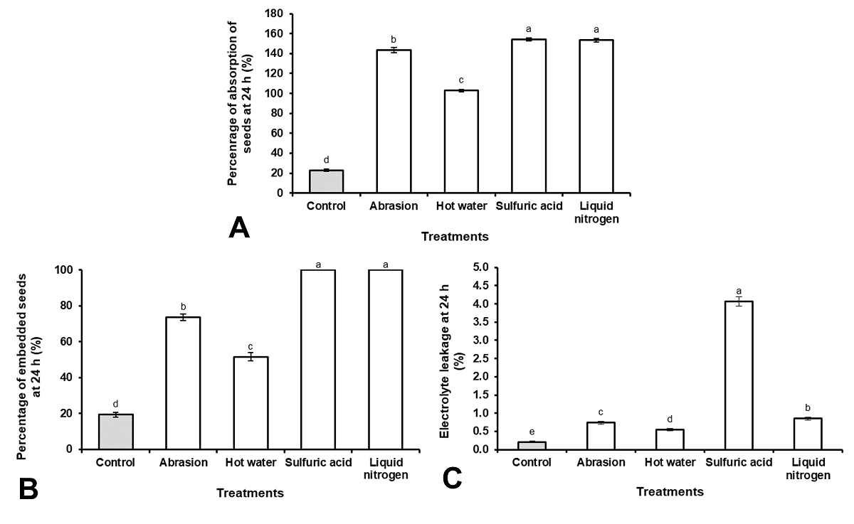 Figure 2 Teramnus labialis seeds physiological changes after scarification. (A) Imbibition capacity, (B) total seeds embedded and (C) electrolyte leakage. Results with the different letter, for each figure, are statistically different (One-way ANOVA, P ≤ 0.05, n = 3. Vertical bars represent mean ± SE.