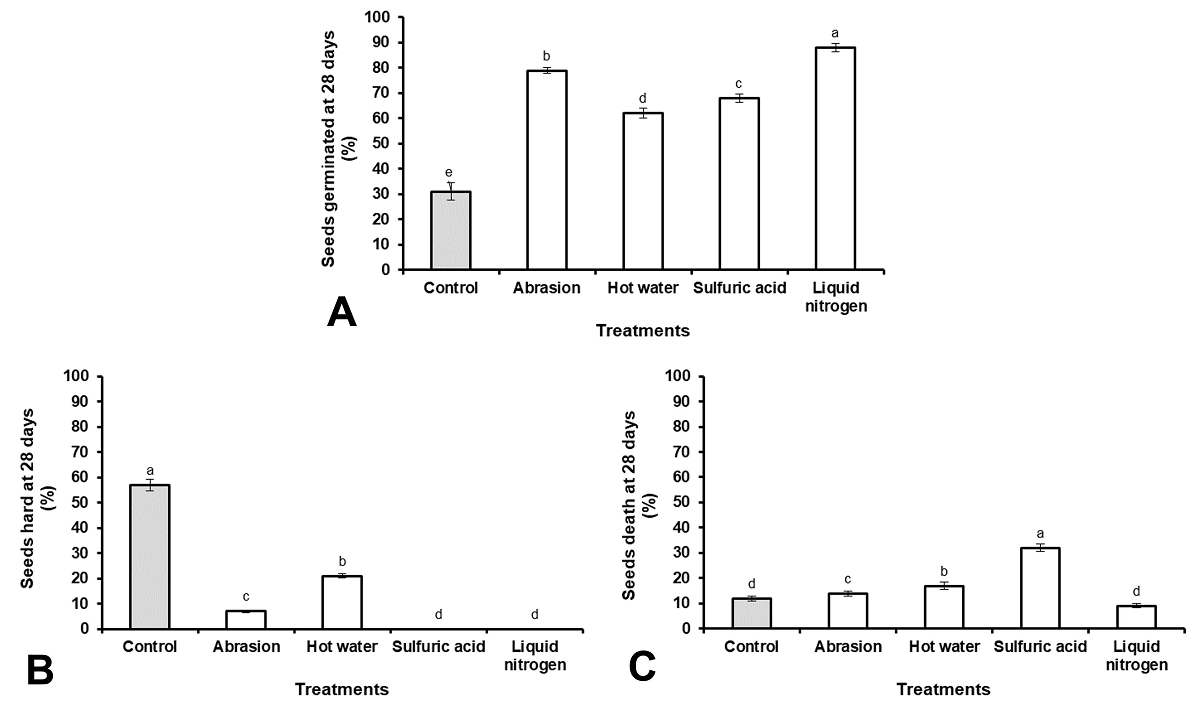 The use of LN as a scarifying agent exhibited the highest percentage of germination (91 %), followed by sanding 79 %, sulfuric acid 68 % and hot water 62 % (Figure 3A). The use of hot water was the scarification treatment that showed the highest percentage of hard seeds (21 %) (Figure 3B), while the scarification with sulfuric acid showed the highest percentage of dead seeds (32 %) (Figure 3C).