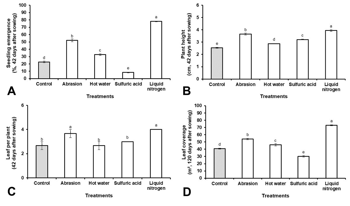 The percentage of plants emerged during the first 42 days after sowing was higher when LN was used as a scarification treatment (Figure 4A), as well as the height of the plants and the number of leaves per plant (Figure 4B, C). With the use of LN as a scarification treatment, 92 % of the covered area was reached 120 days after sowing (Figure 4C).