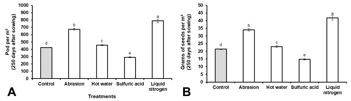 During the reproductive phase, the number of legumes per m2 (Figure 5A) and the total number of seeds per m2 (Figure 5B) were higher in the treatment of seeds scarified with LN. Additionally, the use of sanding was another treatment that showed superior results to the control, while the treatment with sulfuric acid produced the lowest number of legumes and seeds (Figure 5A, B).