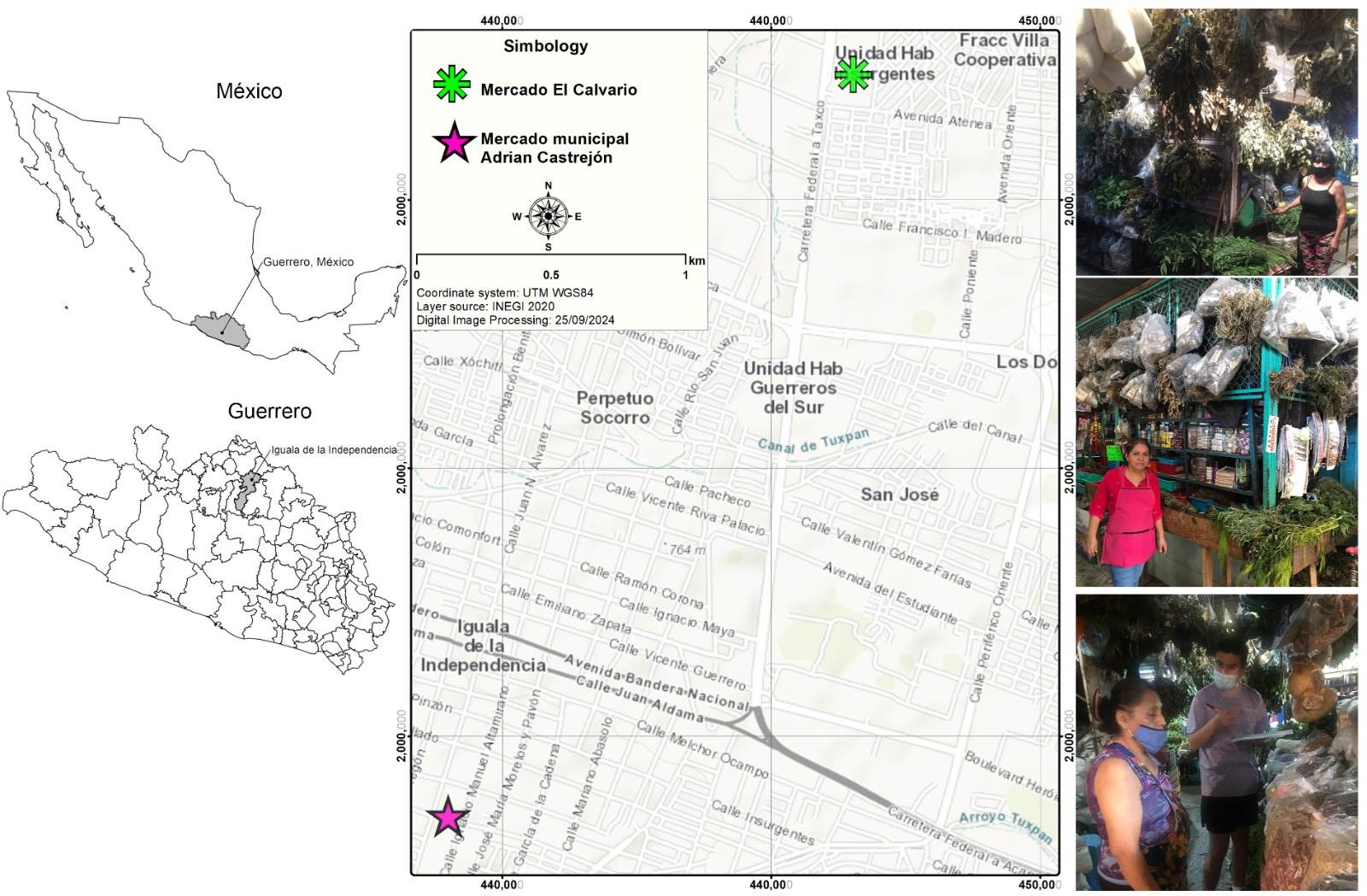 Área de estudio. El estudio se llevó a cabo en los Mercados “Gral. Adrián Castrejón” y “El Calvario” de la ciudad de Iguala, Guerrero, situada entre los paralelos 17° 57’ 13” a 18° 25’ 52” de latitud norte y a 99° 42’ 57” a 99° 25’ 48” de longitud oeste con una altitud entre 500 y 1,900 m snm (INEGI 2009). Ambos mercados son los principales centros de comercialización de plantas medicinales (Figura 1) en Iguala. Esta ciudad cuenta con una población de 154, 173 (INEGI 2010). El clima es cálido subhúmedo con lluvias en verano. La vegetación está conformada por bosque tropical caducifolio, pastizal y matorral crasicaule (INEGI 2009). El municipio de Iguala se encuentra comunicado por tres carreteras estatales (Cocula-Balsas, Tepecoacuilco de Trujano-Huitzuco de los Figueroa-Puebla y El Naranjo-Taxco de Alarcón) y tres carreteras federales (Chilpancingo de los Bravo-Acapulco de Juárez, Teloloapan-Ciudad Altamirano y Cuernavaca-Ciudad de México) (INEGI 2009).