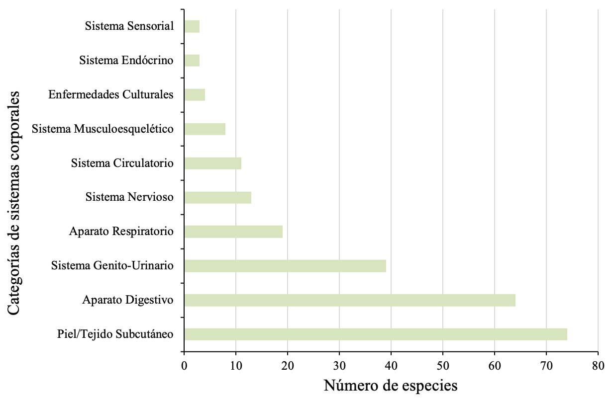 Sistemas corporales. Los principales sistemas corporales identificados en este estudio fueron desórdenes de la piel y tejido subcutáneo, desórdenes del aparato digestivo y desórdenes del sistema genitourinario. Estos resultados concuerdan con trabajos previos que documentan un uso significativo de especies vegetales para estos mismos sistemas en México (González-Ball et al. 2022, García-Flores 2023) y otras regiones del mundo (Liu et al. 2021, Geertsma et al. 2021).
