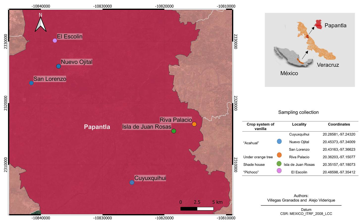 Study area. Four different vanilla management systems were sampled in the locality of Papantla Veracruz, Mexico (Figure 1). The characteristics of each management system are summarized in Table 1.