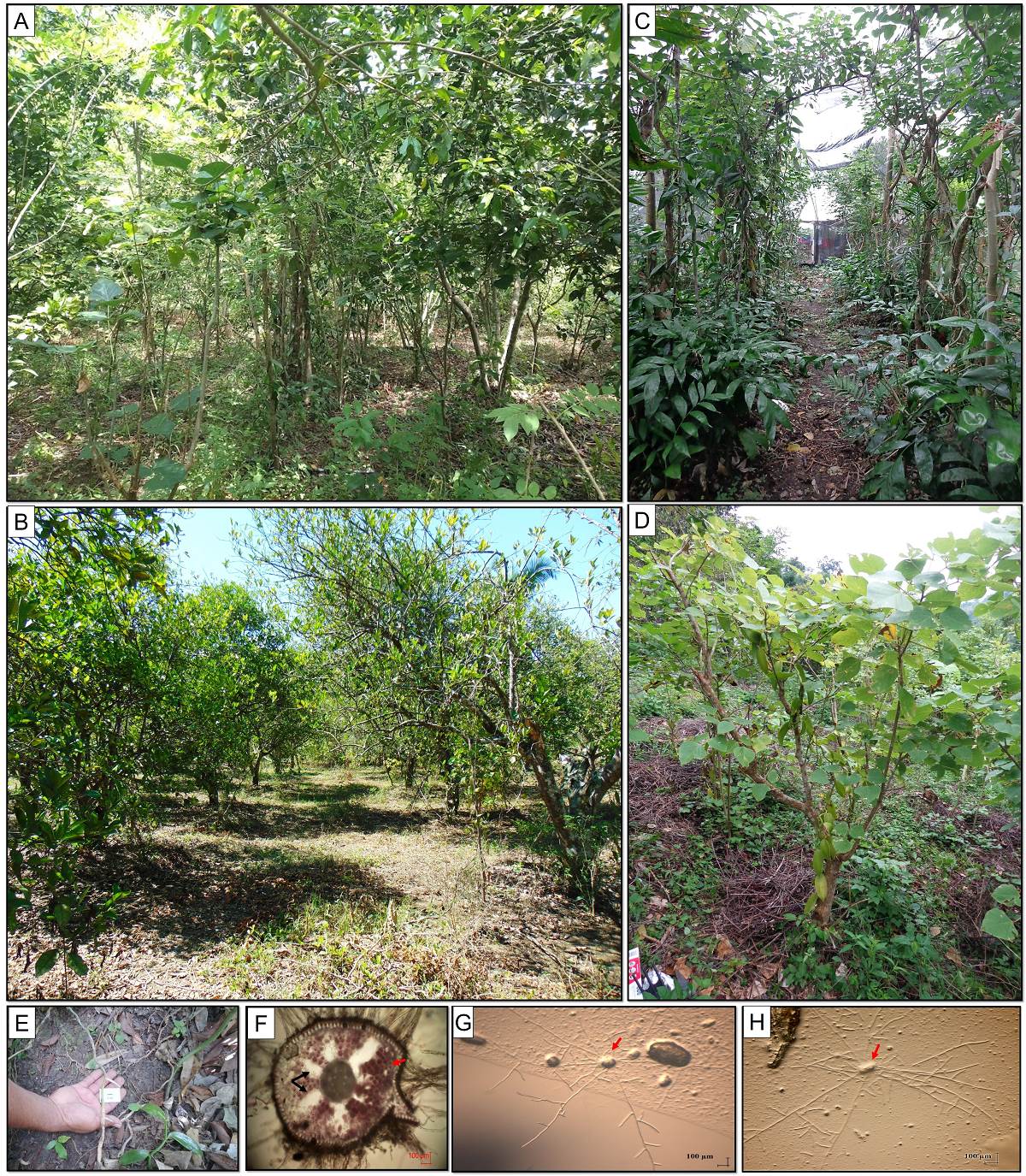 Figure 2 Vainilla planifolia cultivation systems in Papantla, Veracruz. (A) Acahual, (B) under orange tree, (C) shade house, (D) associated with pichoco tree, (E) sampling of terrestrial roots, (F) presence of mycorrhizal pelotons in terrestrial root (red arrow) and aerenchyma around the vascular cylinder (black arrows), (G and H) hyphal growth from the pelotons for isolation. Bar 100 µm.