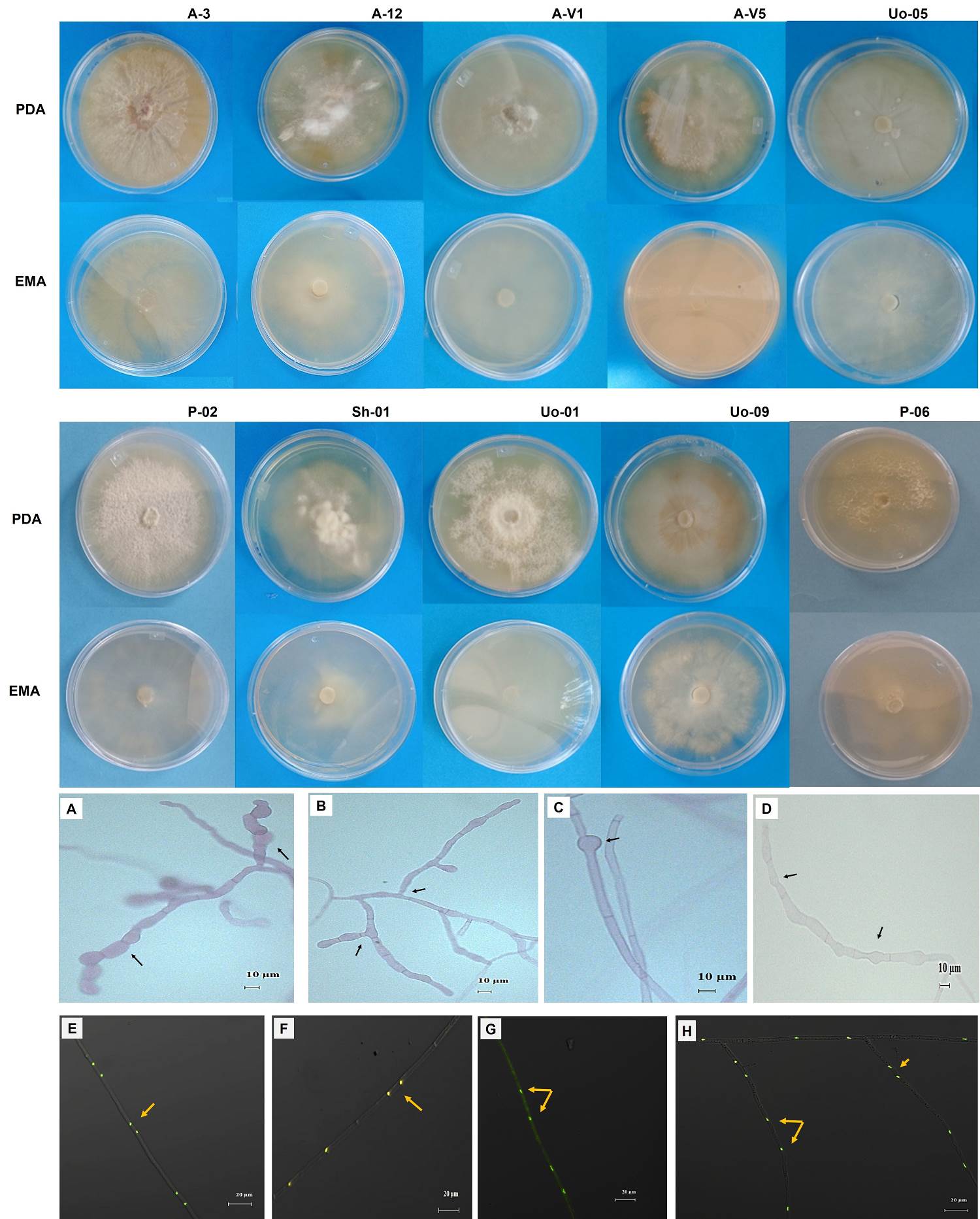 Morphological and physiological characterization of isolates. During the isolation, pelotons with oval and spherical morphotypes were observed in the system under orange trees (Figure 2 G-H). A total of 74 isolates were obtained, of which 10 were mycorrhizal fungi (isolation efficiency 13 %). The cultivar systems that presented the greatest difficulty in isolation were the shade house and the acahual (traditional management system) in the Cuyuxqui community (Figure 1). In the latter, no isolates could be obtained (the resulting sequences were directly obtained from the pelotons in the roots). This may be due to the presence of fungi, such as Fusarium oxysporum, in the soil of the cultivation systems, particularly in the acahual and shade house systems; additionally, plants with lesions such as stem and root rots were observed. The description of the 10 strains with characteristics of the anamorph Rhizoctonia is presented in Table 2. The appearance of the colonies (Figure 3) was of strains with slow growth (< 4 mm per day), submerged mycelium, some were slightly waxy (Uo-01, A-3, A-12, P-02 and P-06) with soft aerial mycelia without forming rings like strains A-V1, A-V5 and Sh-01. The hyphae measured on average 3.6 µm, and some strains presented monilioid cells in digitiform form (A-3, A-V1, Uo-05 and Uo-09) (Figure 3A-B) with other characteristics (Figure 3C-D). All of them presented binucleate hyphae (Figure 3E-H) and were negative to tannin degradation. During the isolation process, there were mostly strains corresponding to morphological characteristics of Fusarium. These isolates presented a white cottony appearance and -as they aged- they turned purple or brown with pink-brown pigmentation on the reverse side. Microconidia and chlamydospores were also observed in the morphological structure, so some were selected for molecular identification (Figure 4).