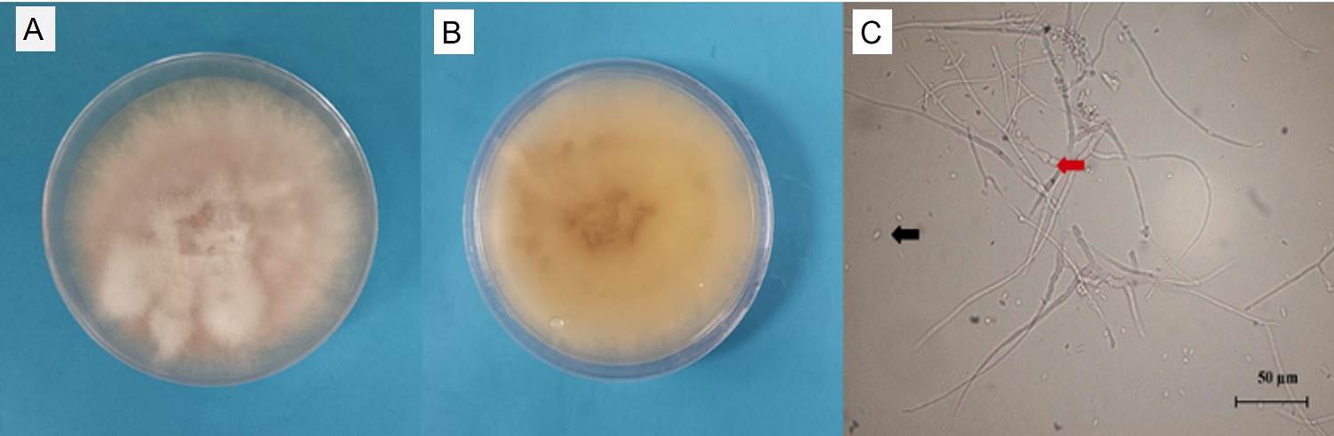 Figure 4 Colonial growth of Fusarium oxysporum f. sp. vanillae Sh-04 isolated from Vanilla planifolia roots of the shade house system in Papantla, Veracruz, Mexico. (A) Front, (B) back, (C) microconidia (black arrow), chlamydospores (red arrow). Bar 50 µm.