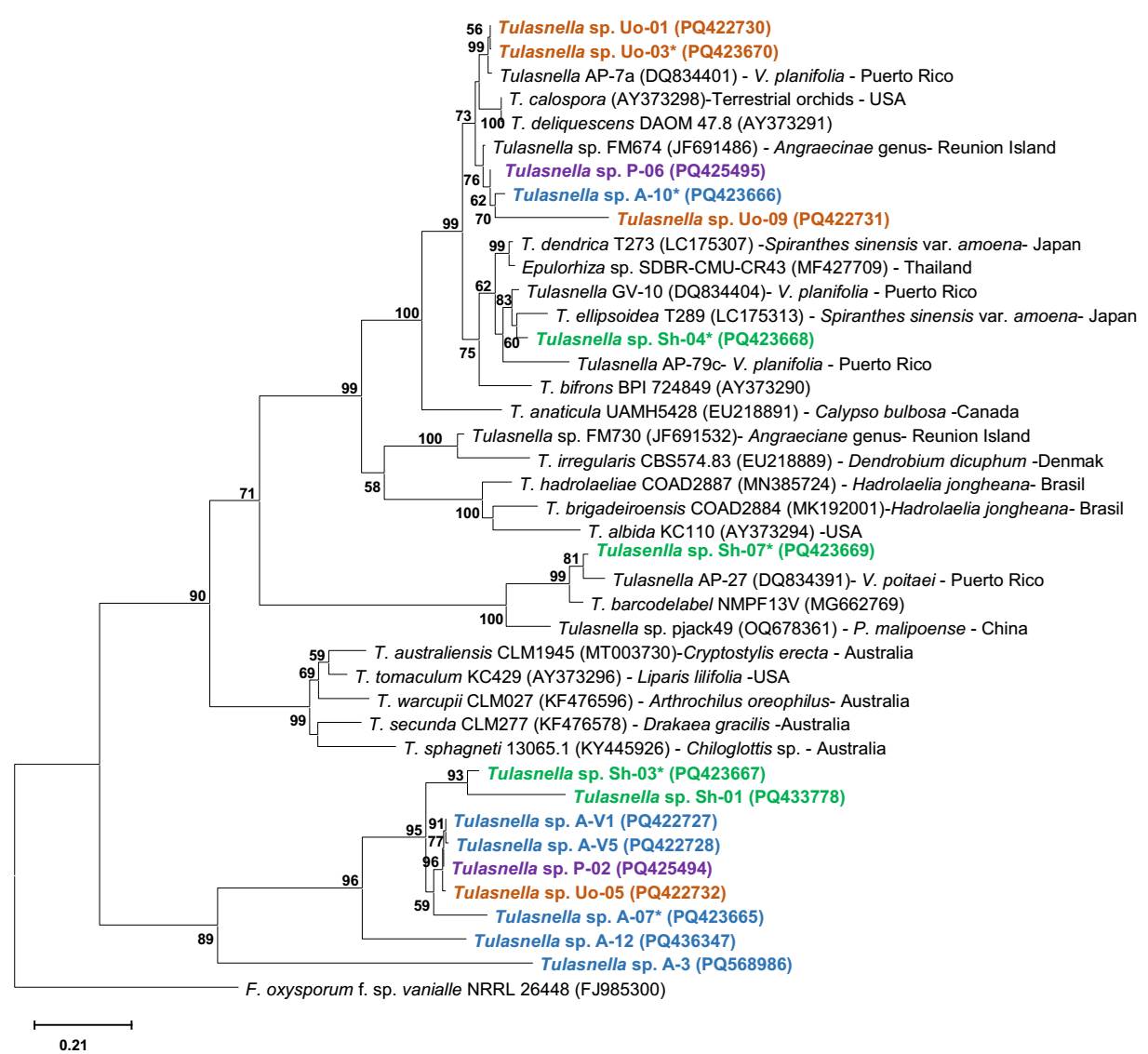 Phylogenetic analysis. The phylogenetic analysis is presented in Figure 5, which shows the distribution of the 16 sequences obtained, of which 6 were directly from mycorrhizal root explants (identified with *), and 10 sequences were obtained from isolates. It was observed that the sequences are grouped in two main clades associated with fungi identified for Vanilla planifolia and V. poitaei from Puerto Rico (Gamboa-Gaitán 2014). These sequences show a 99 % similarity, indicating that they are likely the same species obtained from the system under orange tree (strains Uo-01 and Uo-03*). Strains P-06, U0-09 and A-10* in this same clade are associated with a 99 % similarity to a Tulasnella identified from a terrestrial orchid from Reunion Island (Kumar et al. 2018). Sequence Sh-04* is found in the clade of a Tulasnella isolated from V. planifolia from Puerto Rico, and sequence Sh-07* is found in the clade of a Tulasnella isolated from V. poitaei also from Puerto Rico (Porras-Alfaro & Bayman, 2003) with the same similarity as the previous ones. The remaining isolates form a distinct clade supported by a bootstrap value of 96.0. This clade consists of sequences from the four culture systems, seven isolates, and two tissues (Sh-03 and A-07). The percent similarity to Tulasnella AP-27, isolated from V. poitaei from Puerto Rico, ranged from 94.8 to 97.4 representing the closest clade.