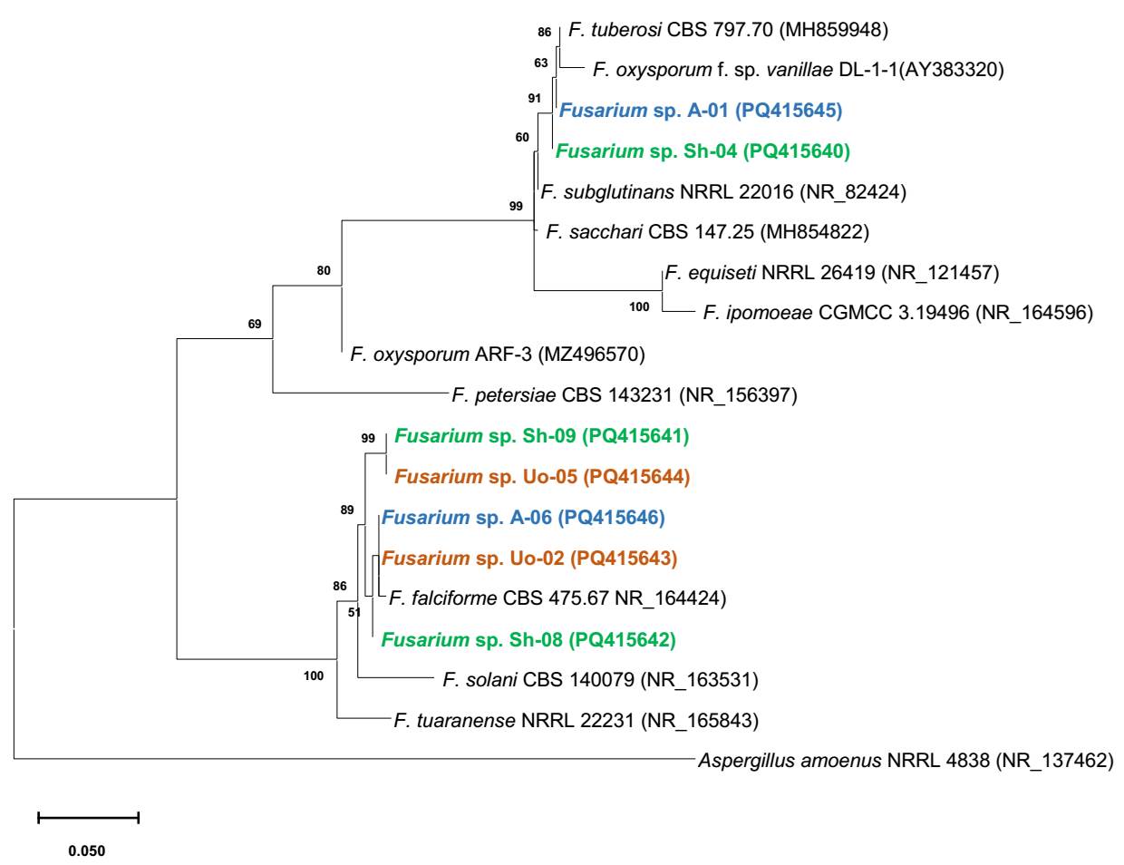 Figure 6 shows the phylogenetic analysis of seven selected Fusarium strains, where five of the strains correspond to F. falciforme, and strains Sh-04 (shade house) and A-01 (acahual) correspond to F. oxysporum f. sp. vanillae (99.99% similarity) -the main pathogen associated with stem and root rot disease (Pinaria et al. 2010, Adame-García et al. 2015).