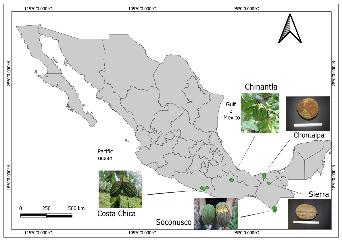 Figure 1 Sampling sites of Theobroma bicolor Humb. & Bonpl. in cacao agroforestry systems located in five cacao growing regions of Mexico and photographs of some of the collected fruits. The coordinates for each sampling site can be found in Table S1 (Supplementary material).
