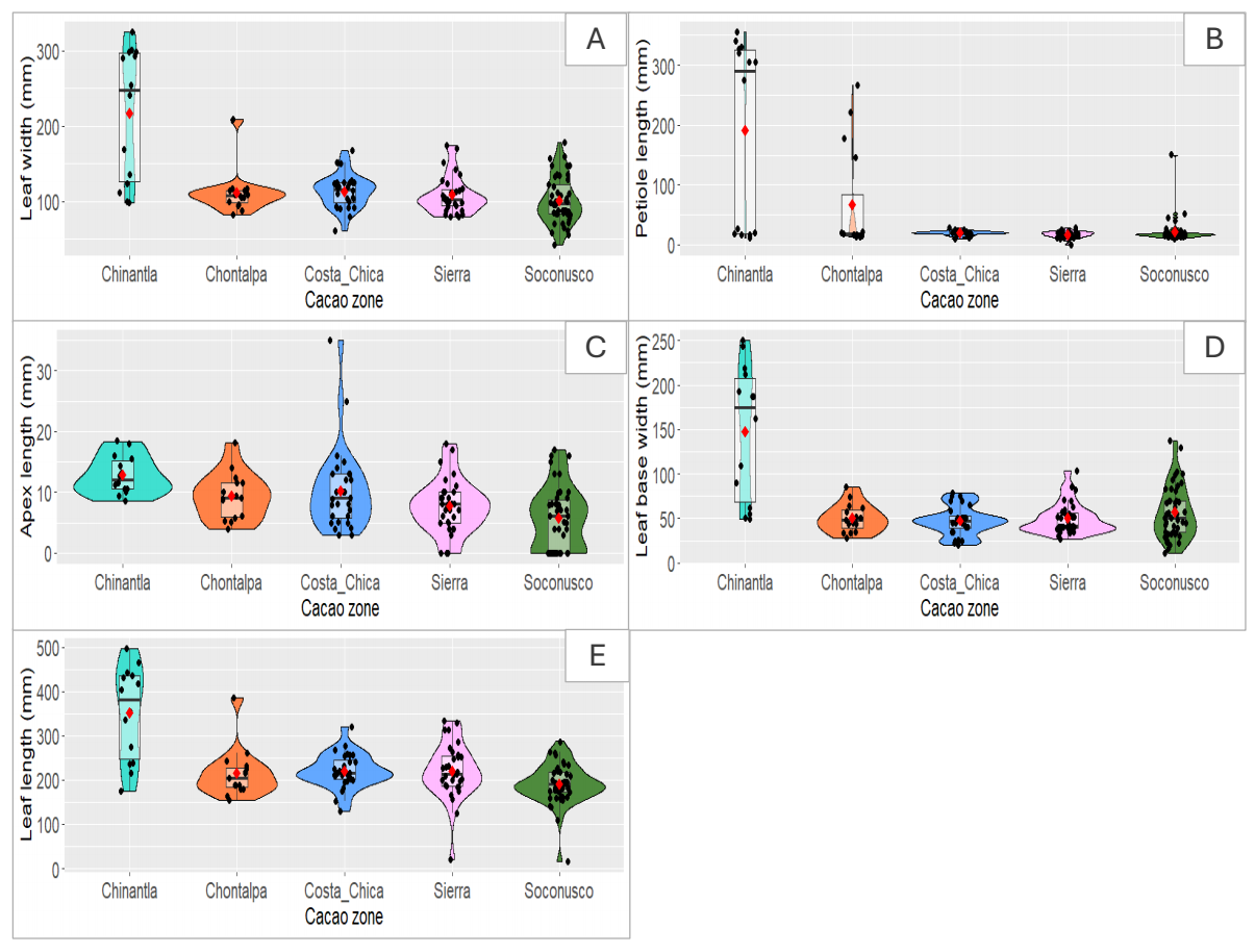 Figure 2 Violin plots showing data distribution and boxplot for pataxte’s (Theobroma bicolor Humb. & Bonpl.) morphological characteristics for leaves collected in cacao growing regions (Chinantla = Oaxaca, Chontalpa and Sierra = Tabasco; Costa Chica = Guerrero; Soconusco = Chiapas). A) Leaf width (mm), B) Petiole length (mm), C) Apex length (mm), D) Leaf base width (mm), E) Leaf length (mm).
