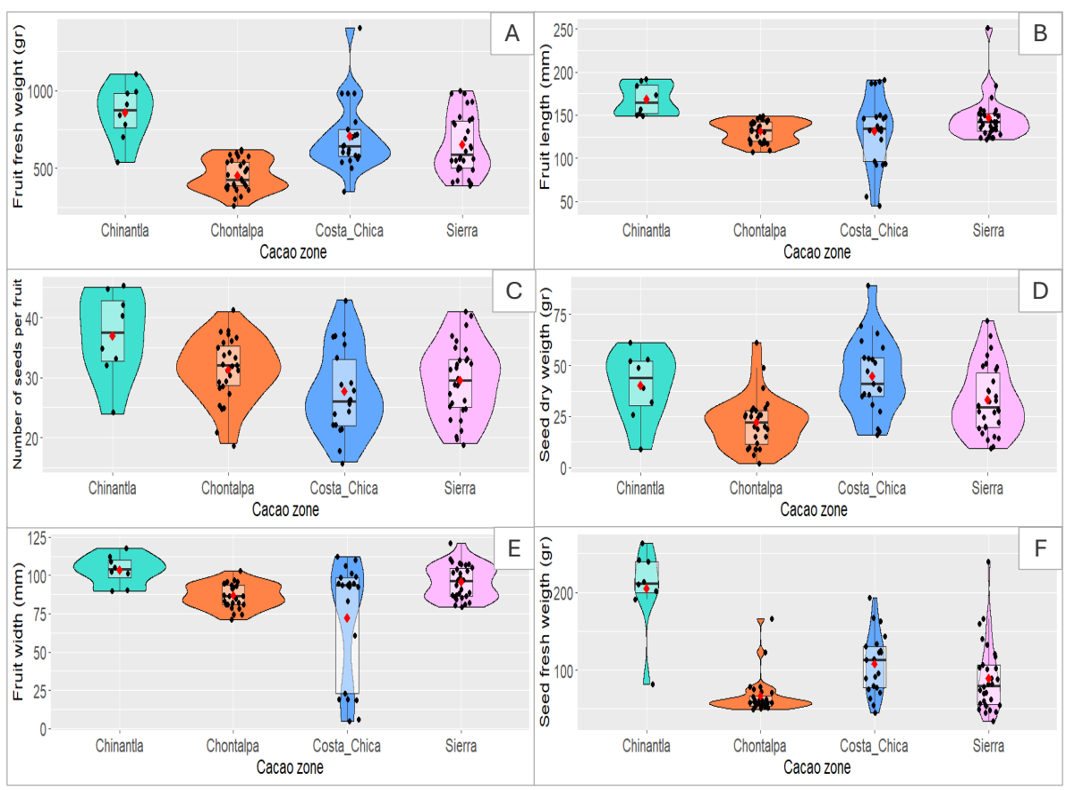 Analysis of morphological data. A small number of samples were obtained per cacao-growing region. Therefore, to characterize morphological variation, data were analyzed by cacao-growing region.