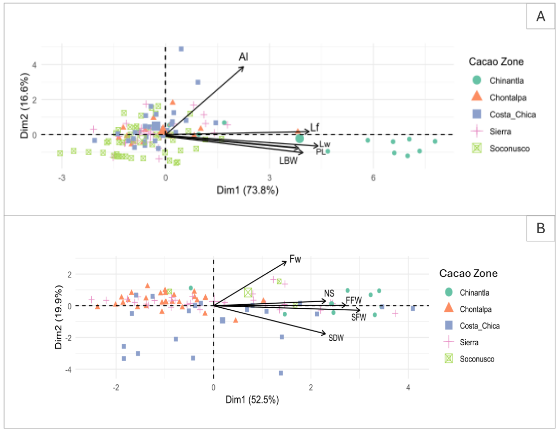 Figure 4 PCA with ordination plot on morphological traits of the pataxte (T. bicolor Humb. & Bonpl.). A) PCA of leaf: Al = Apex length, Lf = Leaf length, Lw = Leaf width, PL = Petiole length, LBW = Width of the leaf base. B) PCA of fruit: Fw = Fruit width, NS = Seed number, FFW = Fres Fruit Weight, SFW = Seed Fresh Weight, SDW = Seed Dry Weight. Larger symbols represent the means for each cacao zone in the space represented by the principal components.