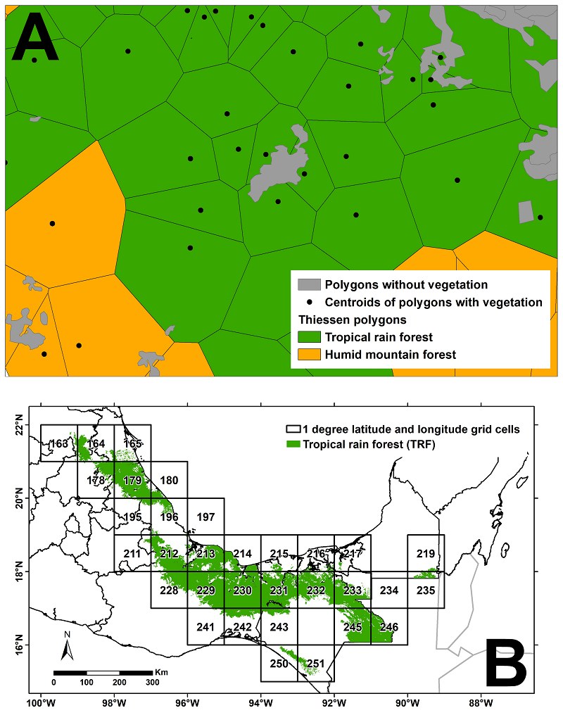 Figure 1 A. Interpolation of vegetation types using Thiessen polygons. The centroids correspond to those polygons on the Land Use and Vegetation map, series VII (INEGI 2021) that could be equated to the vegetation types of Rzedowski (1978). The result of the interpolation are the Thiessen polygons. Those polygons without vegetation in series VII were assigned the corresponding value of their nearest neighboring Thiessen polygon. B. Distribution of Tropical Rainforest in Mexico based on the analytical strategy described in A. The numbering of the grid cells in B corresponds to the numbering used in the diversity analyses described in the text.
