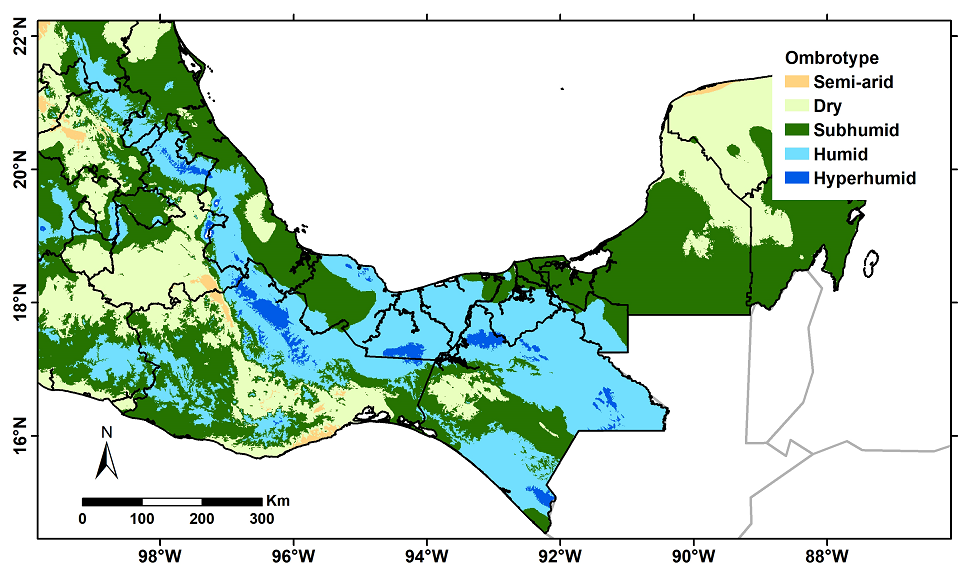 Table 3 Ombrotype classification according to their ombrothermal index (OI). The Tropical Rainforest was delimited considering those pixels in Mexico with OI > 6 (Humid, Hyper-humid, and Ultrahyper-humid ombrotypes.