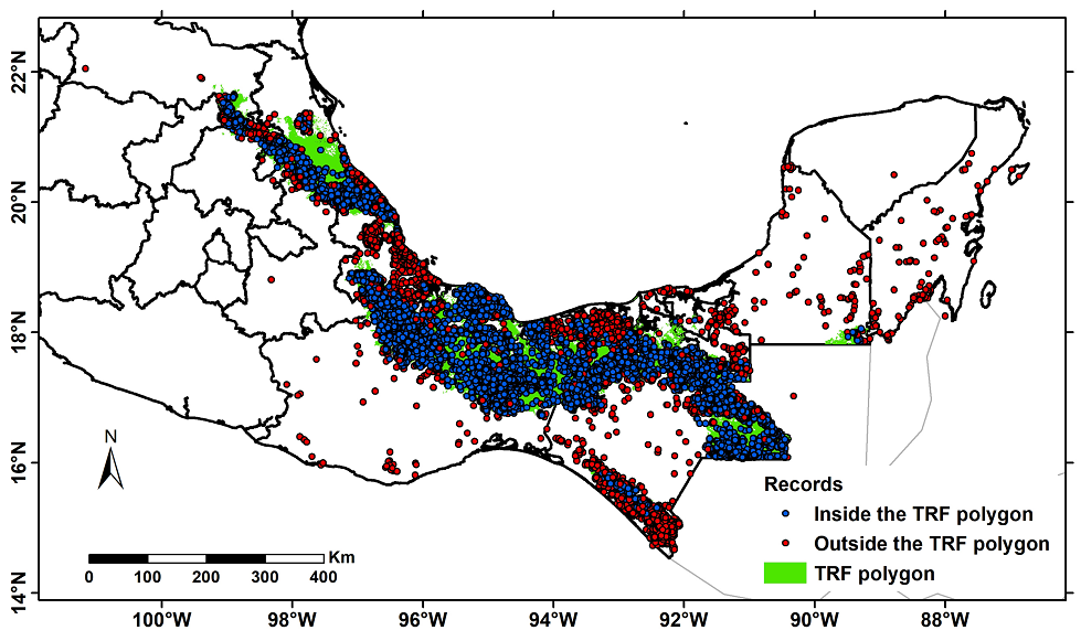 The structured database allowed us to document the existence of 157,646 records from the consulted databases; all these records reported that the species had been collected in TRF or any of its variations considered to create the potential vegetation map of Figure 1B (Table 2). However, the projection of these records on the TRF polygon revealed some records outside this polygon; these were only used to determine the majority rule described in Materials and Methods (N = 42,776 records, Figure 3).