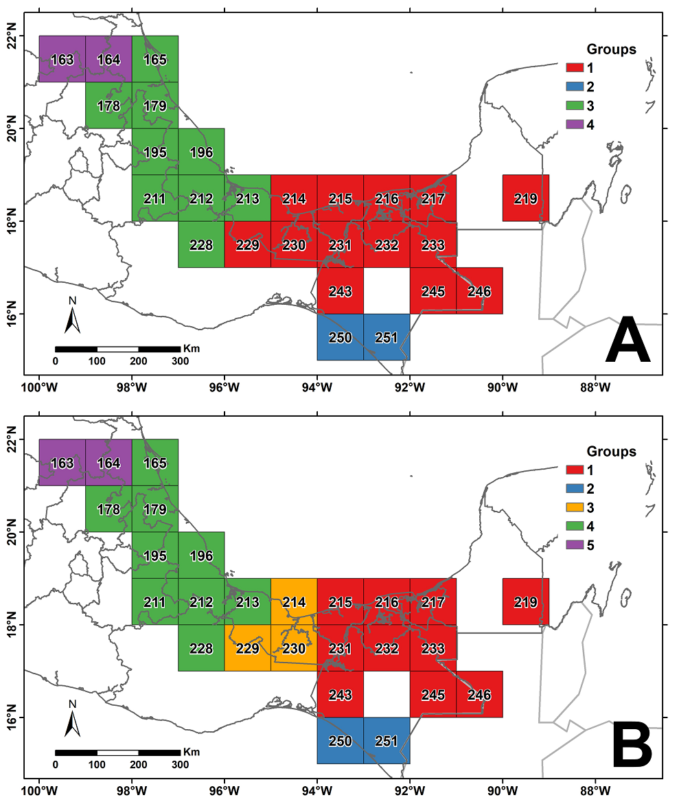 Floristic regions in the Mexican tropical rainforest. The five-group regionalization (Figure 4B) only differs from the four-group solution (Figure 4A) in an intermediate region, including three grid cells (214, 229, and 230) in the central portion of the TRF distribution. This intermediate region corresponds to the TRF located in central Veracruz and the Chimalapas-Uxpanapa region, at the limits of Oaxaca, Chiapas, and Veracruz states. The location of this region suggests its transitional character between the communities distributed west and east of the geographical constriction represented by the Isthmus of Tehuantepec. Because the Isthmus region is characterized by low elevations, it has been suggested to act as a barrier for different groups of organisms, especially for animals dwelling in montane habitats (Duellman 1960, Peterson et al. 1999). The assessment of this hypothesis is beyond the objectives of this study, but the data included in the Supplementary Material can be used to examine it.