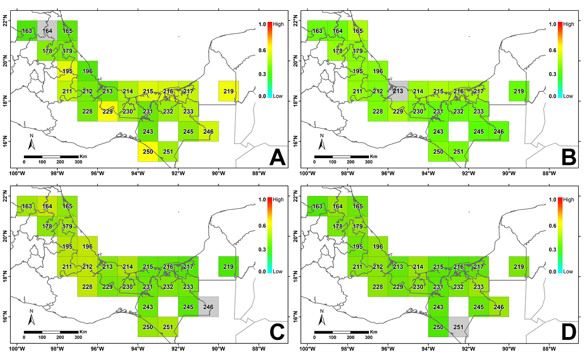Figure 5 Map showing taxonomic turnover with respect to different focal grid cells (in gray). The scale within the color gradient from orange to red indicates high dissimilarity, whereas the scale from blue to yellow indicates lower dissimilarity. A. Grid cell 164 (Huastec region). B. Grid cell 213 (North-Central Gulf of Mexico). C. Grid cell 246 (Southeastern Mexico). D. Grid cell 251 (Soconusco region).