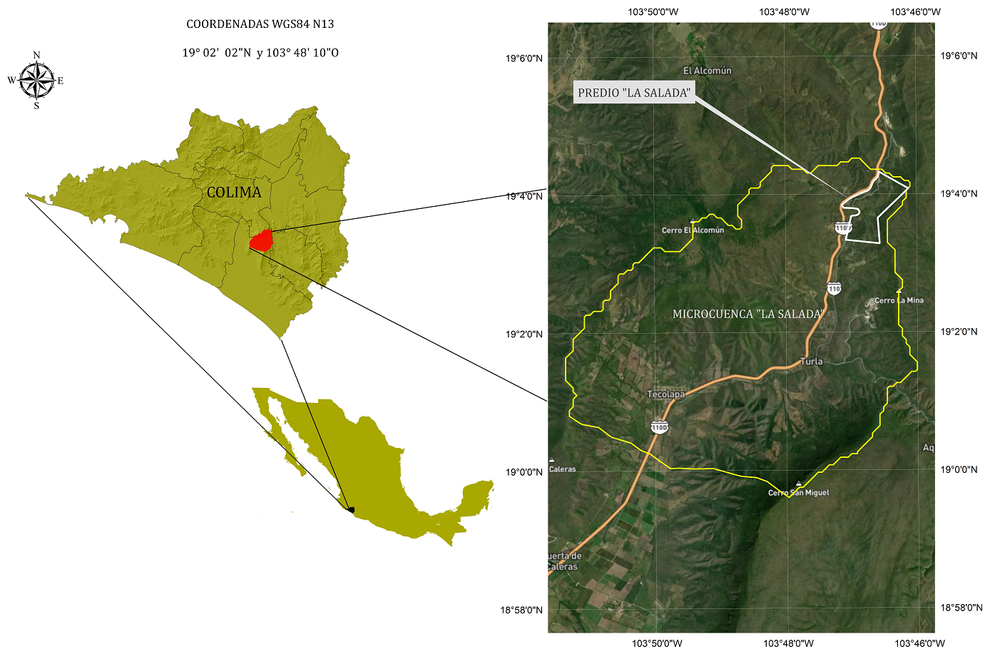 Área de estudio. La Salada es un predio privado propiedad de la Empresa Holcim-Apasco Operaciones, México, que se localiza en el municipio de Tecomán, Colima, a 1.8 km al NE del poblado de “La Salada”, entre 18-19 km al SSW de la ciudad de Colima, en las coordenadas extremas latitud N 19.054538° y 19.072184° y longitud O 103.768427° y 103.785880°