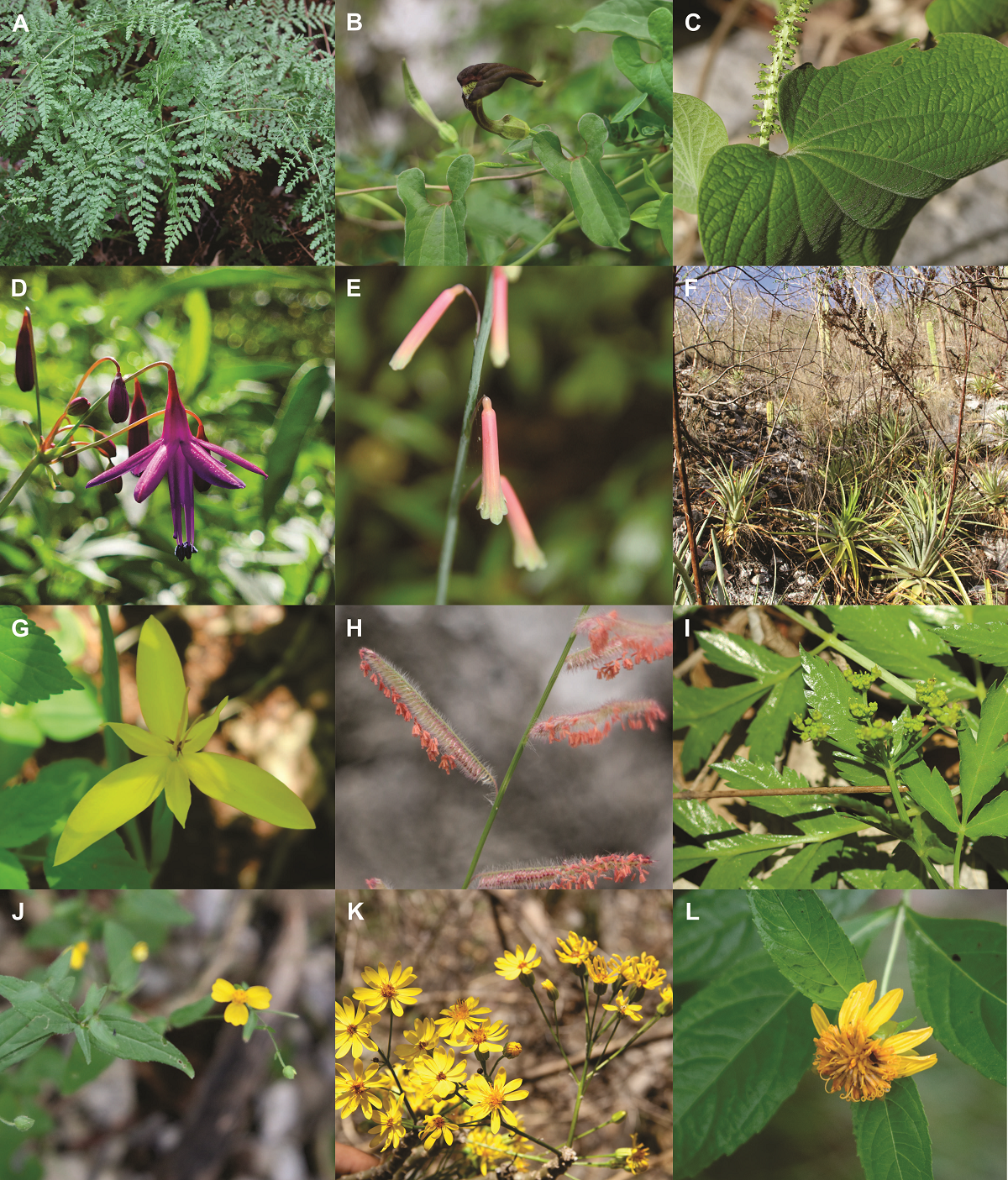 Figura 2 Especies cuyos tipos nomenclaturales se recolectaron en La Salada. A. Anemia colimensis, B. Aristolochia colimensis, C. Piper abalienatum, D. Bessera ramirezii, E. Polianthes howardii, F. Hechtia laevis, G. Colima convoluta, H. Bouteloua elata, I. Prionosciadium turneri, J. Melampodium nutans, K. Pittocaulon filare, L. Verbesina mickelii.