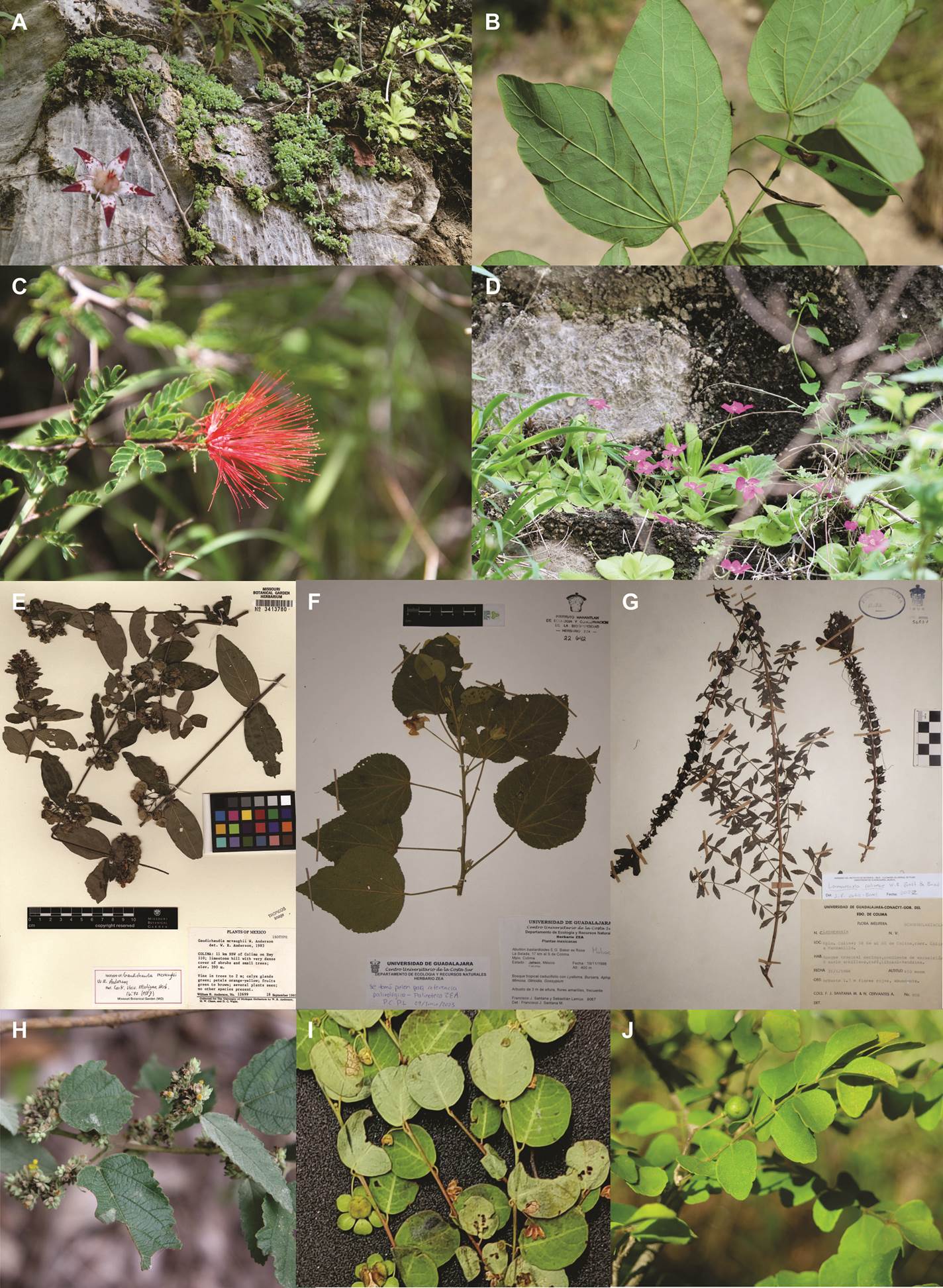 Figura 3 Especies cuyos tipos nomenclaturales se recolectaron en La Salada. A. Quetzalcoatlia glassii, B. Bauhinia gypsicola, C. Calliandra colimae, D. Pinguicula colimensis, E. Aspicarpa mcvaughii, F. Abutilon bastardioides, G. Lamourouxia colimae, H. Waltheria bicolor, I. Phyllanthus gypsicola, J. Megastigma morenoi.