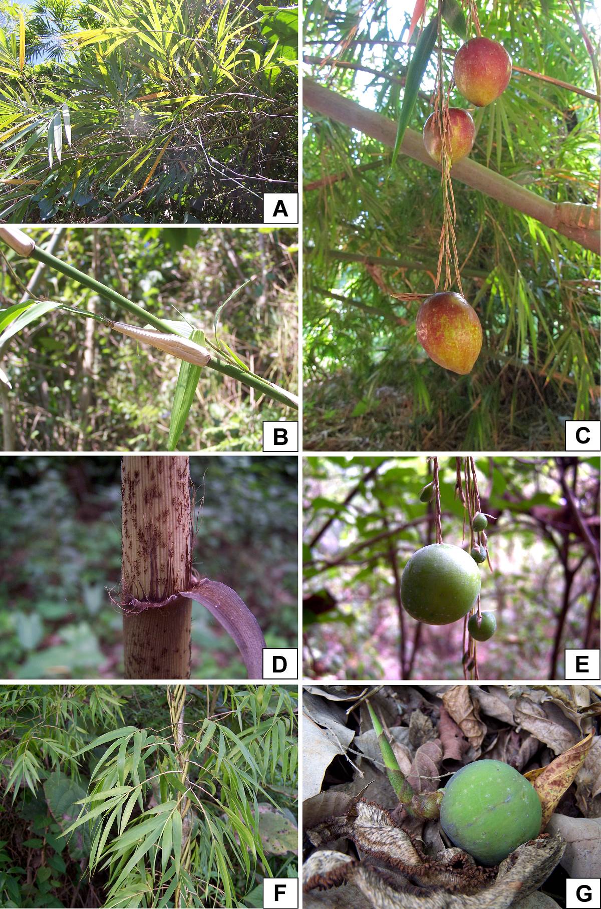 Figure 1 A-C. Olmeca recta. A. Foliage leaves. B. Young culm showing branching. C. Bacoid fruits. D-G. Olmeca reflexa. D. Culm leaf, showing reflexed blade. E. Bacoid fruits in distinct maturation periods. F. Foliage leaves. G. Germinating bacoid fruit.