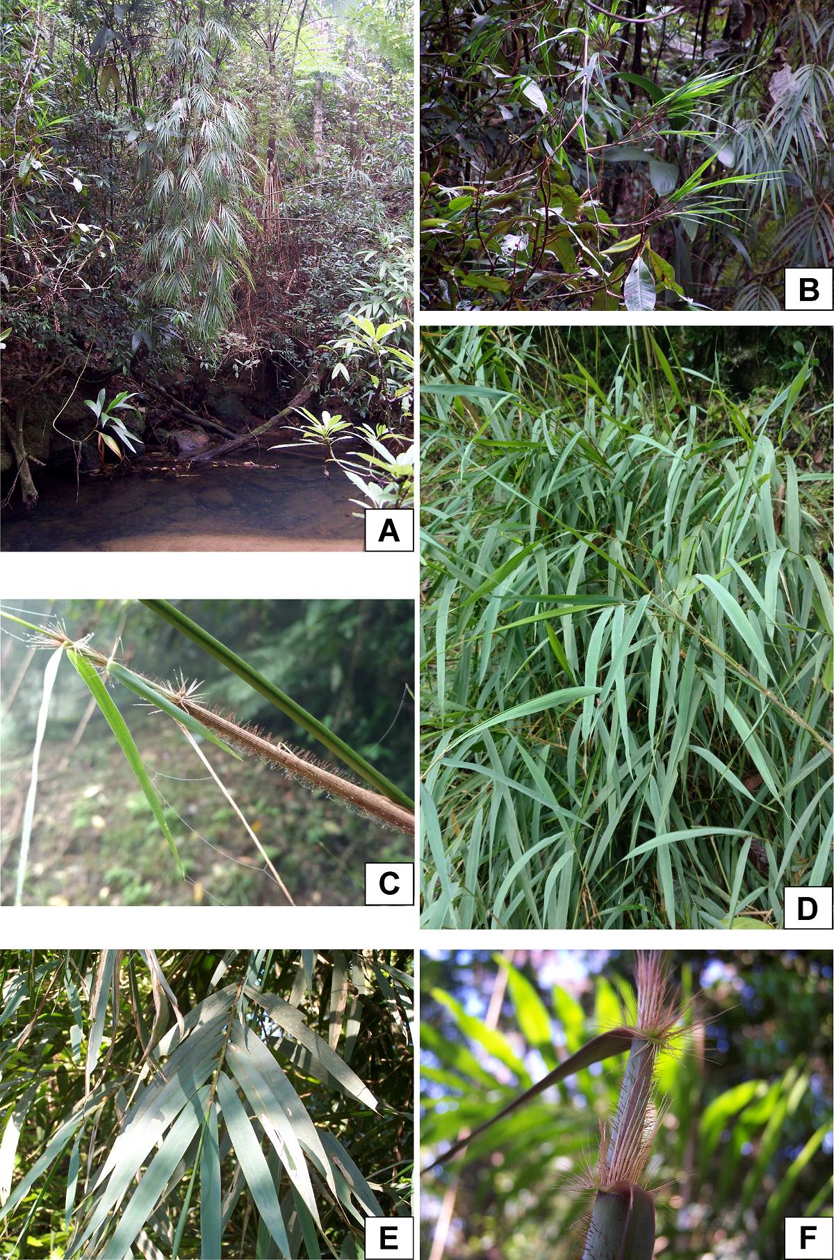 Figure 2 A-B. Olmeca clarkiae. A, Arching culm showing branches and foliage leaves. B. Foliage leaves. C-D. Olmeca fulgor. Main culm branching, showing culm leaves and blades. D. Foliage leaves. E-F. Olmeca zapotecorum. E. Foliage leaves. F. New shoot showing culm leaves and blades.