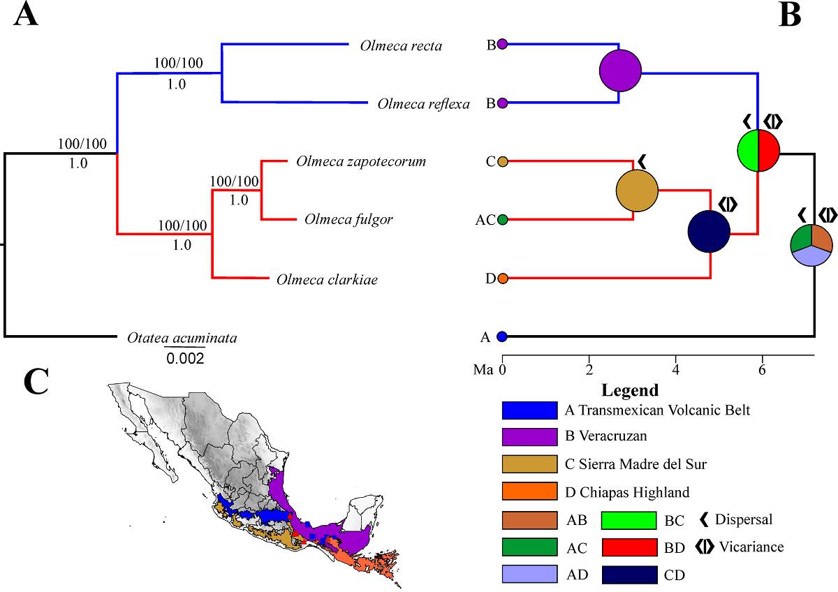 Our ancestral area reconstruction identified two possible ancestral regions for Olmeca, each with equal probability (50 %): Veracruzan + Chiapas Highland provinces or Veracruzan + Sierra Madre del Sur provinces. The reconstruction suggests that, in the first scenario, a dispersal event occurred from Veracruzan to Sierra Madre del Sur, whereas in the second scenario, dispersal occurred from Veracruzan to Chiapas Highland. However, in both cases, a vicariance event took place, leading to the separation of the ancestral Veracruzan province from the other two areas. This implies a division between montane cloud forests and tropical lowland ecosystems.