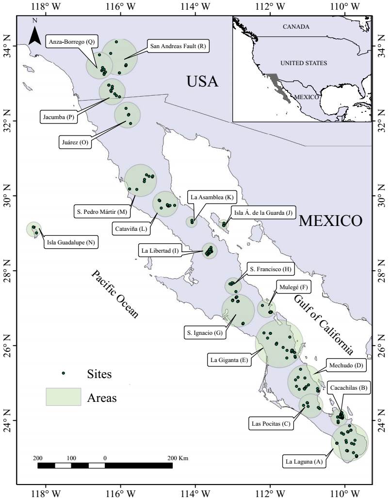 Figure 1 Distribution of 235 palm grove sites across southern California (USA) and the Baja California Peninsula (Mexico). Shaded circles indicate palm grove areas grouping sites into 18 areas listed alphabetically from South to North.