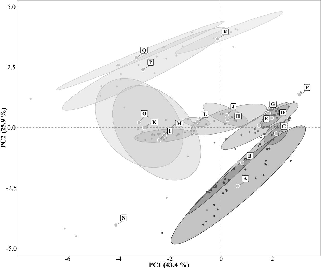 Figure 2 Principal Component Analysis of 235 palm grove sites across southern California and the Baja California Peninsula, based on 19 bioclimatic variables from the WorldClim dataset. Sites are grouped into 18 areas listed in Figure 1 (from South to North, A-R), with 95 % confidence ellipses based on Student´s t-distribution. The first two components explain 69.3 % of the climatic variation.