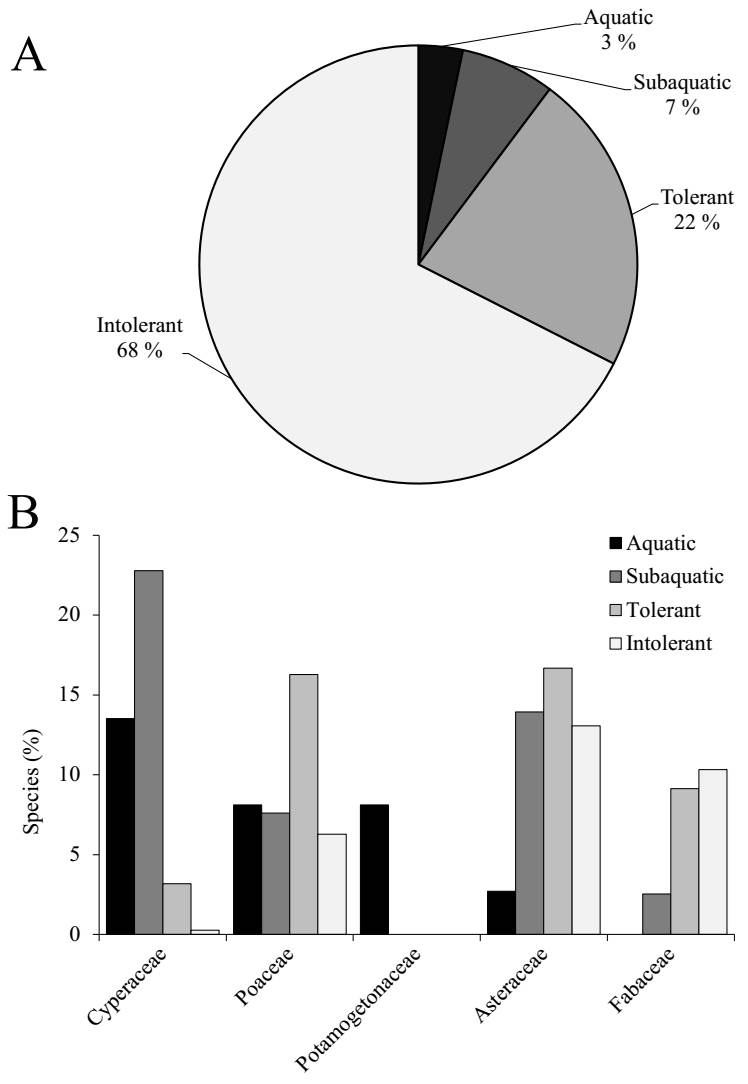 Figure 3 Species distribution by wetland category. (A) Proportion of all species across four wetland categories (aquatic, subaquatic, tolerant, and intolerant species). (B) Relative abundance (%) of species from families representing > 5 % within each wetland category: Cyperaceae, Poaceae, Potamogetonaceae, Asteraceae, and Fabaceae.