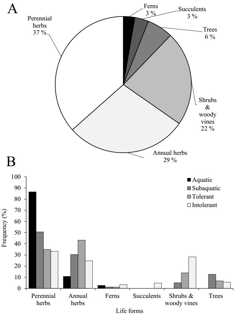 Perennial herbaceous species were the most common life form across the dataset (37 %), followed by annual species (29 %) and shrubs (22 %). Trees (6 %), succulents (3 %), and ferns (3 %) were comparatively less represented (Figure 4A). Life form composition varied across water-dependence categories (Figure 4B). Perennial herbaceous species dominated the aquatic group (86 %), but their frequency declined with decreasing water dependence - dropping to 51 % among subaquatic species, 35 % among tolerant species, and 33 % among intolerant species. In contrast, annual herbaceous species exhibited the opposite trend, rising from 11 % in aquatic species to 30 % in subaquatic and peaking at 43 % in tolerant species, before declining slightly to 25 % among intolerant species. Shrubs were absent from aquatic species and increased steadily across drier categories, from 5 % in subaquatic species to 14 % in tolerant and 28 % in intolerant species (Figure 4B).