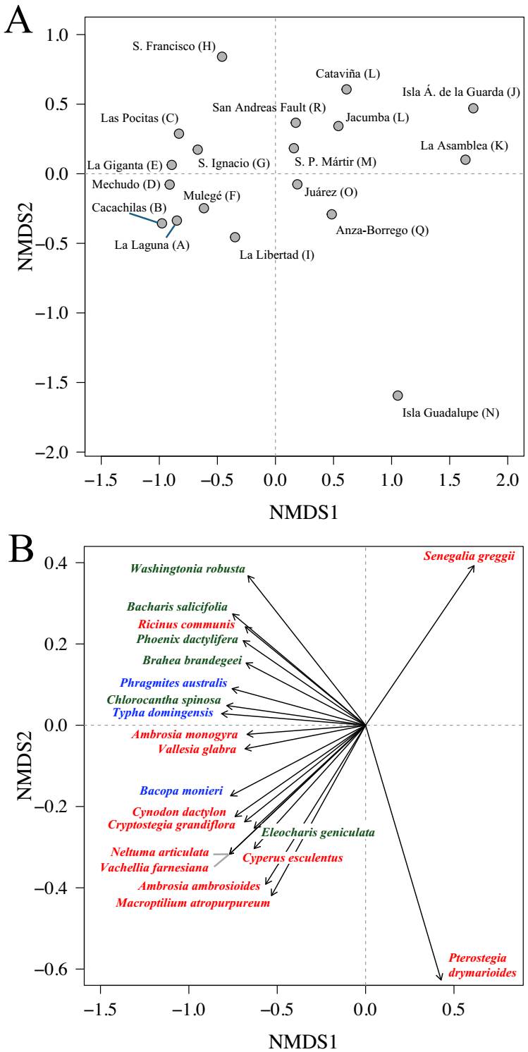 Figure 5 NMDS ordination of 18 palm grove areas listed in Figure 1 (from South to North, A-R) in southern California and the Baja California Peninsula based on species composition of hydrophytic flora (aquatic, subaquatic, and tolerant species) (stress = 0.124) . (A) Ordination of areas in two-dimensional space. (B) Species vectors were significantly associated with the ordination (P < 0.01). Axis ranges in (B) are different from (A) representing a subset of the ordination space. Species color indicates functional group: blue = aquatic, green = subaquatic, red = tolerant species.